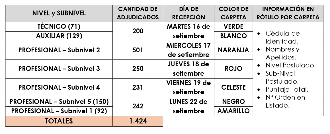 Por otro lado, se comunica a los POSTULANTES ADJUDICADOS DEL MINISTERIO DE SALUD PÚBLICA Y BIENESTAR SOCIAL que el día LUNES 15 de setiembre de 2025, se estará publicando el Cronograma para la RECEPCIÓN DE DOCUMENTACIONES EN FÍSICO.