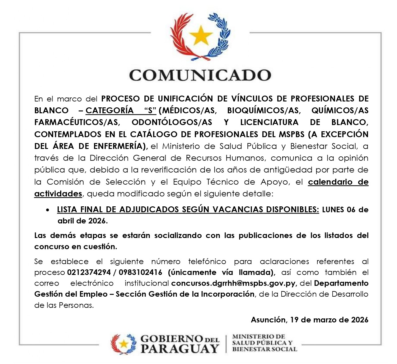 En el marco del PROCESO DE UNIFICACIÓN DE VÍNCULOS DE PROFESIONALES DE BLANCO – CATEGORÍA “S” (MÉDICOS/AS, BIOQUÍMICOS/AS, QUÍMICOS/AS FARMACÉUTICOS/AS, ODONTÓLOGOS/AS Y LICENCIATURA DE BLANCO CONTEMPLADOS EN EL CATÁLOGO DE PROFESIONALES DEL MSPBS (A EXCEPCIÓN DEL ÁREA DE ENFERMERÍA), se socializa LA LISTA DE POSIBLES BENEFICIARIOS (APLICAN), para que el interesado acceda a la verificación de su antigüedad en el vínculo PERMANENTE, así como también en el vínculo CONTRACTUAL a unificar, por grupo ocupacional.