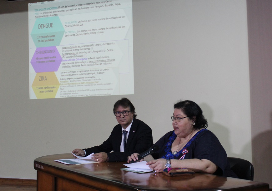 El Ministerio de Salud, a traves de su Direccion General de Vigilancia de la Salud, actualiza la situacion de las arbovirosis, con datos acumulados de enero hasta el 11 de mayo de 2018. CHIKUNGUNYA A NIVEL PAÃS • 45 casos confirmados. • 224 casos probables. • Casos confirmados en Amambay (43); Central, Ita (1); y Guaira, Villarrica (1). • Casos probables en Amambay (201), Paraguari (12), Central (7), Asuncion (3) y Caazapa (1). BROTE DE CHIKUNGUNYA EN AMAMBAY Brote activo en Pedro Juan Caballero, con 43 casos confirmados y 201 casos probables. Los mismos proceden de 12 barrios de la capital: 1. Bernardino Caballero. 2. General Genes. 3. Guarani. 4. Jardin Aurora. 5. Maria Victoria. 6. Obrero. 7. Perpetuo Socorro. 8. San Blas. 9. San Gerardo. 10. Virgen de Caacupe. 11. Defensores del Chaco. 12. San Juan Neuman. Ante esta situacion, la cartera sanitaria emitio una alerta preventiva, de tal manera a intensificar las acciones de prevencion, teniendo en cuenta el elevado riesgo de dispersion a otros departamentos a consecuencia del alto porcentaje de infestacion larvaria existente a nivel nacional. Ademas, se suman factores que favorecen a la dispersion: 1. Persistencia de criaderos inservibles en areas ya intervenidas. 2. Urbanizacion desordenada y no planificada. 3. Ineficiente recoleccion de basuras. 4. Escasa participacion comunitaria y de otros actores involucrados directa o indirectamente en la respuesta. 5. Inestabilidad climatica que dificulta el control quimico del Aedes aegypti, permitiendo que se mantenga una elevada infestacion vectorial, lo que configura un cuadro epidemiologico netamente favorable a la transmision y propagacion de los virus Dengue, Chikungunya y Zika. DENGUE • 2.929 confirmados acumulados. • 21.768 probables acumulados. • 13 fallecidos confirmados. Pais: Los principales departamentos que registran notificaciones son Paraguari, Boqueron, Itapua, Presidente Hayes y Amambay. Asuncion: Los barrios con mayor numero de notificaciones son: Obrero y Zeballos Cue. Central: Los distritos con mayor numero de notificaciones son: San Lorenzo, Capiata, nemby, Limpio y Luque. ZIKA • 2 casos confirmados. En el distrito de San Lorenzo, departamento Central, en los barrios San Miguel y Tayasuape. • 1 caso probable. Sindrome congenito y/o neurologico asociado a Zika Microcefalia. 12 notificaciones: 7 descartados y 5 en estudio. Sindromes neurologicos con probable asociacion a ZikaV. ï‚§ 28 casos notificados de sindromes neurologicos con probable asociacion a ZikaV. ï‚§ 26 casos a Sindrome de Guillain Barre y 2 a encefalitis con sospecha de infeccion por arbovirus. ï‚§ 1 caso de SGB confirmado asociado a Zika, 15 descartados y 12 sospechosos.