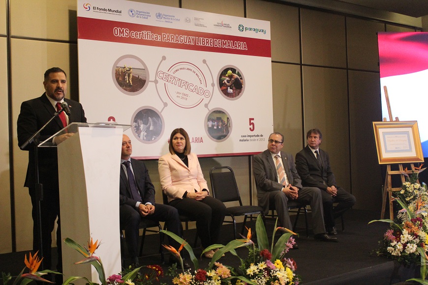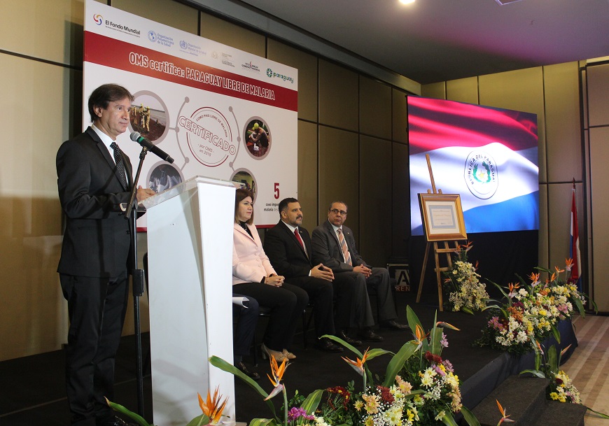 La Organizacion Mundial de la Salud (OMS) avalo a Paraguay como pais libre de malaria, lo que representa un logro historico para la salud publica. Es el primer pais de America en recibir la certificacion en 45 anos, desde la otorgada en Cuba en 1973. Para celebrar este hito de la Salud Publica de nuestro pais, a nivel local se llevo a cabo un acto oficial, con la presencia de autoridades nacionales e internacionales, en el hotel Crowne Plaza de Asuncion. La apertura del mismo estuvo a cargo del Dr. Nicolas Aguayo, director del SENEPA, dependencia tecnica del Ministerio de Salud que lidero las acciones para la eliminacion de la malaria del territorio nacional. En la oportunidad, el Ministro de Salud, Dr. Carlos Morinigo, agradecio a los colaboradores del SENEPA, pilares fundamentales de la lucha sostenida contra la enfermedad, como asi tambien a los organismos internacionales que apoyaron al pais en este desafio: la OPS/OMS y el Fondo Mundial para la lucha contra el sida, la tuberculosis y la malaria. â€Å“Paraguay se situa en un nivel de gran reputacion en salud publica, representando un ejemplo para otras naciones que se hallan con el fuerte compromiso de seguir avanzando hacia la eliminacion de la malariaâ€, sostuvo el titular de la cartera sanitaria. Por su parte, el representante de la OPS/OMS en Paraguay, Dr. Luis Roberto Escoto, puso de relieve el sitial que ocupa nuestro pais. â€Å“Sin duda, esta es una ocasion historica para toda la Region de las Americas ya que, despues de 45 anos, Paraguay es el primer pais en lograr esta certificacion, cumpliendo de esta manera uno de los objetivos del Desarrollo Sostenible para el 2030â€, expreso, al tiempo de hacer publico su reconocimiento al pueblo paraguayo y al gobierno por haber puesto fin a la transmision autoctona de la malaria en el pais, presentando ademas el mensaje de la Dra. Carissa Etienne, Directora de la Organizacion Panamericana de la Salud. â€Å“Nos sentimos muy contentos por el trabajo conjunto y el apoyo comprometido del senor presidente de la Republica, Excelentisimo Horacio Cartes, del Congreso, del Ministerio de Salud, de los incansables trabajadores voluntarios y, lo mas importante, de toda la gente del Paraguay. Es un ejemplo que nos llena de alegria a todas las Americas. Muchas felicidades por ese compromiso y trabajo arduo realizados durante tantos anosâ€, declaro Etienne en su mensaje al pais. Igualmente, Filipo Iarrea, representante del Fondo Mundial para la lucha contra el sida, la tuberculosis y la malaria, resalto los esfuerzos sostenidos a lo largo de decadas, recalcando que los mismos deben seguir firmes para evitar su reintroduccion. â€Å“Estamos muy felices de lo que Paraguay ha efectivamente logrado obtener, y estoy convencido de que este sentimiento de orgullo, que es tambien personal, se ha compartido en el pais. De hecho, no solamente logro la eliminacion de la malaria, sino que tambien es el primer pais latinoamericano en recibir esta importante certificacion de la Organizacion Mundial de la Salud desde hace 45 anos y, tambien fueron el primer pais de la region sudamericana en recibirla, e igualmente lidera entre los 20 paises del mundo hacia la eliminacion de la malariaâ€, anadio. La prevencion, la vigilancia y la deteccion temprana de casos, asi como el manejo integrado de vectores, el diagnostico oportuno y el tratamiento gratuito y eficaz, junto con la promocion, la comunicacion y las alianzas estrategicas, ademas del fortalecimiento de los servicios de salud y la ampliacion de la cobertura de redes para el diagnostico y la vigilancia, fueron pilares fundamentales del abordaje para la erradicacion de la malaria. Ademas de las citadas autoridades, acompanaron el acto la Dra. Maria Teresa Baran, ex directores del SENEPA, jefes de zonas de esta institucion, asi como funcionarios y funcionarias de la cartera estatal.
