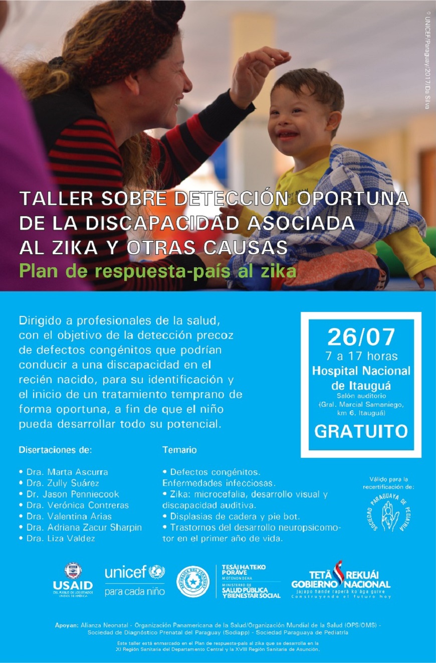 â€Å“Taller sobre deteccion oportuna de la discapacidad asociada al Zika y otras causas†se impartira este jueves 26 de julio, en el hospital Nacional de Itaugua, cuyo objetivo es llevar a cabo la deteccion precoz de los defectos congenitos que podrian conducir a una discapacidad en el recien nacido. El curso es gratuito y se desarrollara de 7:00 a 17:00, en el salon auditorio del citado centro asistencial, en el marco del Plan de respuesta - pais al Zika que se desarrolla en Central y Asuncion. Esta dirigido a los profesionales de la salud. La Dra. Marta Ascurra, responsable del Programa de Prevencion de Enfermedades Congenitas, dependiente del Ministerio de Salud Publica, sostiene que con este taller se busca capacitar al personal sanitaria en la identificacion de discapacidades que puedan referir los ninos desde el nacimiento vinculadas al virus Zika u otras causas, para brindarles el tratamiento oportuno, para que puedan desarrollarse con todo su potencial. Entre esas discapacidades figuran, la microcefalia, la discapacidad auditiva y visual, que si son tratadas de manera precoz y reciben el estimulo suficiente, se puede mejorar o corregir la condicion del nino, segun sea el caso. Defectos congenitos. Enfermedades infecciosas; Zika: microcefalia, desarrollo visual y discapacidad auditiva; displasias de cadera y pie bot; Trastornos del desarrollo neuropsicomotor en el primer ano de vida, son temas que seran tratados durante la jornada. La disertacion estara a cargo de los doctores: Marta Ascurra; Zully Suarez; JasonPenniecook; Veronica Contreras; Valentina Arias; Adriana ZacurSharpin; y Liza Valdez. Esta actividad es organizada por el Programa de Prevencion de Defectos Congenitos, en conjunto con USAID y UNICEF. Con el apoyo de la Alianza Neonatal, OPS/OMS, Sociedad de Diagnostico Prenatal del Paraguay y la Sociedad Paraguaya de Pediatria. Inscripciones Las inscripciones se realizaran en el dia. Cada participante recibira una carpeta, boligrafo y otros materiales de difusion sobre los defectos congenitos asociados al Zika, prevencion y deteccion precoz; asi como una cinta metrica para el perimetro cefalico. Al termino del taller, se hara entrega de certificados a los participantes y pendrive con material del taller.