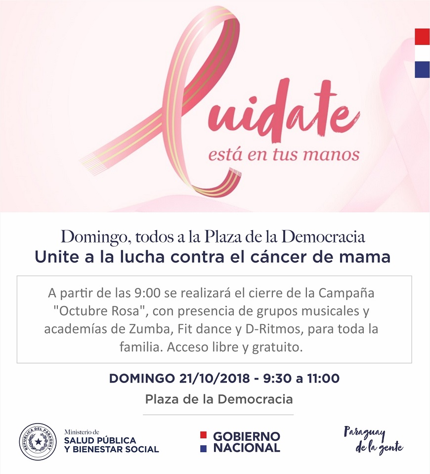El Instituto Nacional del Cancer (INCAN) invita a la ciudadania a sumarse al cierre de la Campana de Prevencion y Diagnostico Precoz del Cancer de Mama, que tendra lugar en la Plaza de la Democracia, este domingo 21 de octubre, de 9:00 a 11:30. Se llevara a cabo con un festival artistico y cultural, buscando sensibilizar sobre la prevencion de la enfermedad. Durante la jornada, se contara con la participacion de grupos musicales como, Taiko Japan Bunka y Asunshow. Los presentes podran deleitarse con la realizacion de actividad fisica al ritmo de zumba; tambien se contara con la presentacion de academias de Fit Dance y D-Ritmos. La actividad nucleara a pacientes, familiares y publico en general. El cancer de mama se constituye en la causa numero uno de mortalidad por cancer en mujeres de nuestro pais. En el 2017, fueron diagnosticadas 1.616 con esta patologia, y 538 de ellas fallecieron por este motivo. La prevencion es la mejor manera para evitar llegar a estadios avanzados, que tienen un alto costo e impacto en la vida de nuestras mujeres.