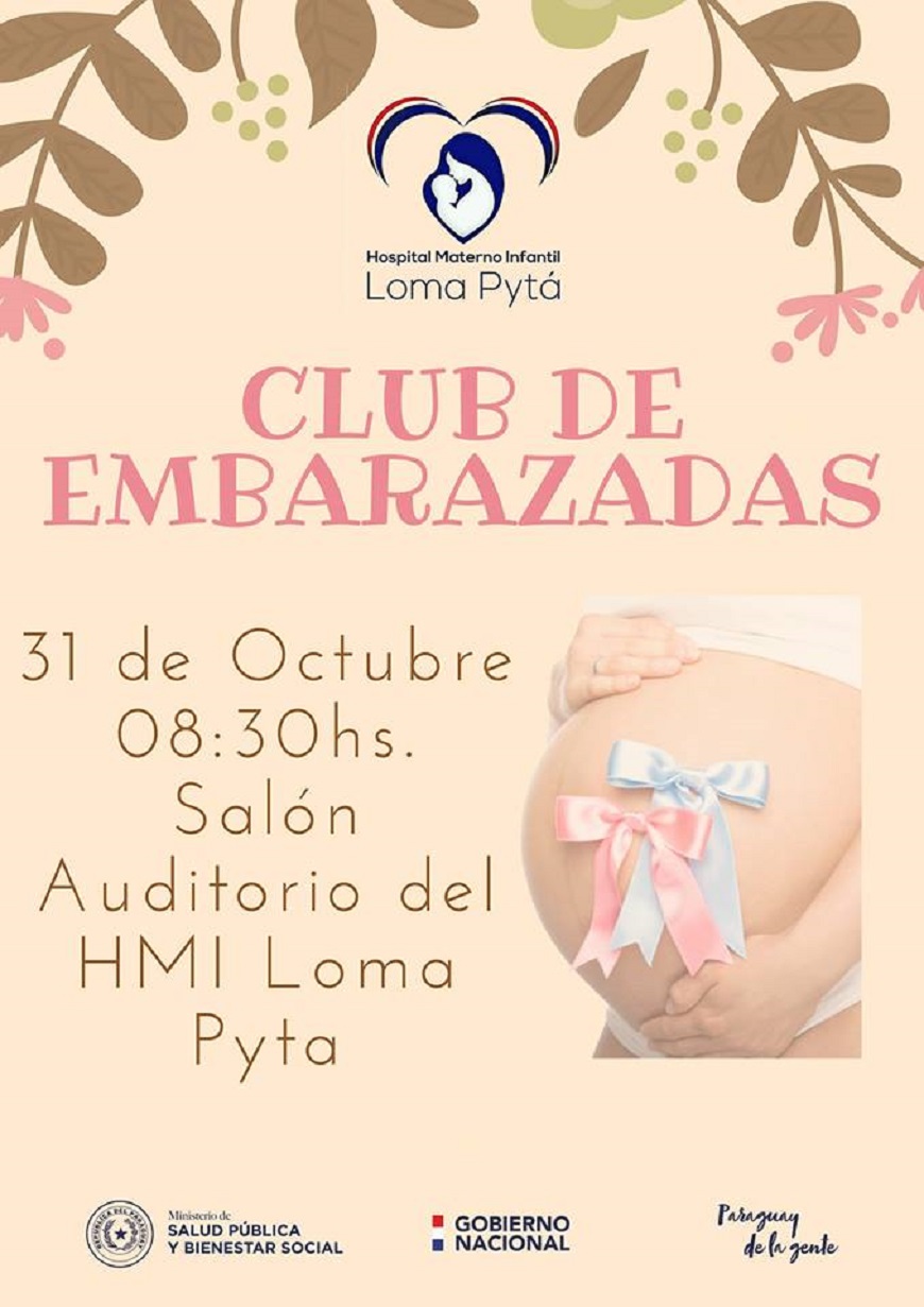El Club de Embarazadas es un espacio en el que los profesionales del servicio de salud brindan a las usuarias todo el soporte necesario para cursar un embarazo saludable y llegar a un parto sin complicaciones. En el materno infantil de Loma Pytã, manana miercoles 31 de octubre, tendra lugar un proximo encuentro del Club, desde las 08:30, en el salon auditorio de la institucion. Una de las aristas de esta iniciativa es incentivar el involucramiento de las parejas de las usuarias en todo el proceso del embarazo y, ademas, cuidar de su propia salud mediante controles permanentes. Objetivos del Club de Embarazadas • Brindar un espacio educativo acorde a los temas principales que deben ser encarados en el periodo prenatal, como: importancia de los controles y estudios, signos de alarma, alimentacion saludable, actividad fisica, lactancia materna, cuidados del recien nacido, etapas del embarazo, desarrollo del feto, preparacion para el parto normal, entre otros. • Apoyar a las embarazadas y a sus parejas en cuanto a las dudas e inquietudes que tengan. • Generar un ambiente de reflexion y de empatia, a fin de compartir experiencias sobre la gestacion. • Crear vinculo entre los futuros padres y el bebe en gestacion.