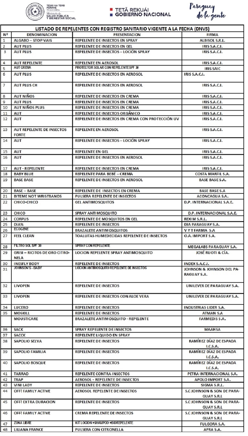 El Ministerio de Salud, a traves de la Direccion Nacional de Vigilancia Sanitaria, informa que, hasta la fecha, 48 repelentes de distintas marcas cuentan con registro sanitario vigente, los cuales pueden ser adquiridos en comercios locales. En total, son tres mas en relacion a la anterior lista, emitida el 22 de enero pasado.