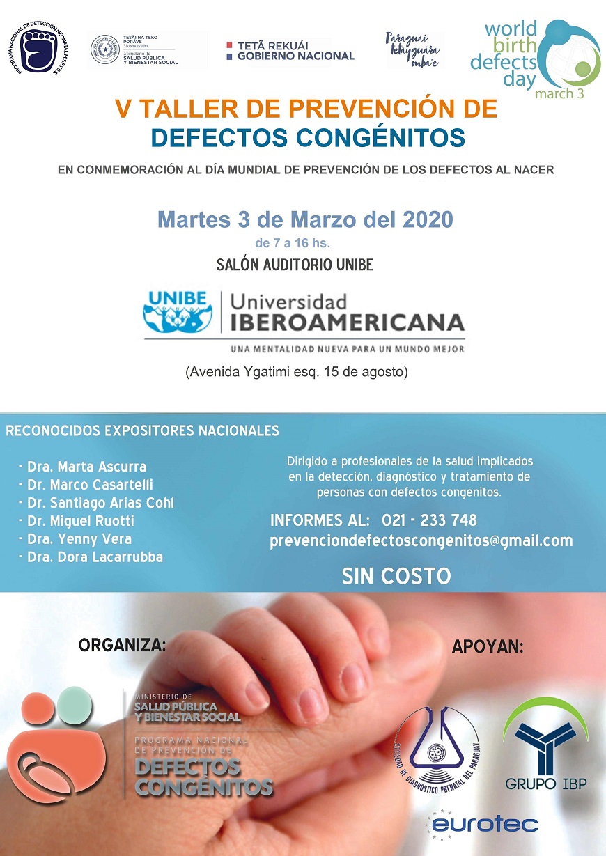 El Programa Nacional de Prevención de Defectos Congénitos del Ministerio de Salud Pública y Bienestar Social (PNDC), realizará el V Taller de Prevención de Defectos Congénitos, el día 3 de marzo, de 7 a 16 horas, en el Aula Magna de la Universidad Iberoamericana (15 de agosto esq. Ygatimi).