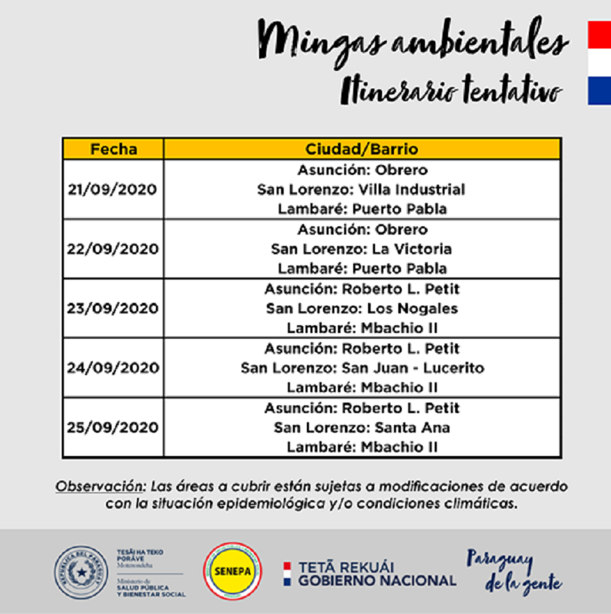 Este martes, la brigada trabajara en los barrios: Obrero (Asuncion), la Victoria (San Lorenzo) y Puerto Pabla (Lambare). El dia miercoles, en Roberto L. Petit (Asuncion), Los Nogales (San Lorenzo) y Mbachio II (Lambare). Las actividades continuaran el jueves, en Roberto L. Petit, de Asuncion, San Juan y Lucerito, de San Lorenzo, y Mbachio II, de Lambare. El ultimo recorrido de esta semana se efectuara en Roberto L. Petit, de Asuncion, Santa Ana, en San Lorenzo, y Mbachio II, en Lambare. Cabe recordar que, el dia de ayer, la actividad tuvo lugar en barrio Obrero (Asuncion), Villa Industrial (San Lorenzo) y Puerto Pabla (Lambare). Se resalta el apoyo de la Secretaria de Emergencia Nacional (SEN), municipalidades y otras instituciones aliadas a estas acciones de eliminacion de criaderos y prevencion de enfermedades arbovirales, como Dengue, Zika y Chikungunya. Asi tambien, es importante recordar que, invertir 10 minutos al dia para la busqueda y eliminacion de potenciales criaderos es suficiente para lograr un Paraguay sin Dengue, Zika y Chikungunya.