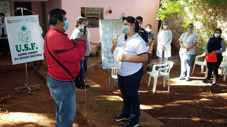 El equipo de salud de la XIII Region Sanitaria, Amambay, es acompanado por personal del SENEPA, asi como de la Secretaria de Turismo de la Gobernacion y de la Camara de Comercio de la zona. Cabe mencionar que, antes de emprender el recorrido, realizaron una concentracion en las primeras horas de la manana, en la Unidad de Salud de la Familia (USF) del Barrio Obrero.