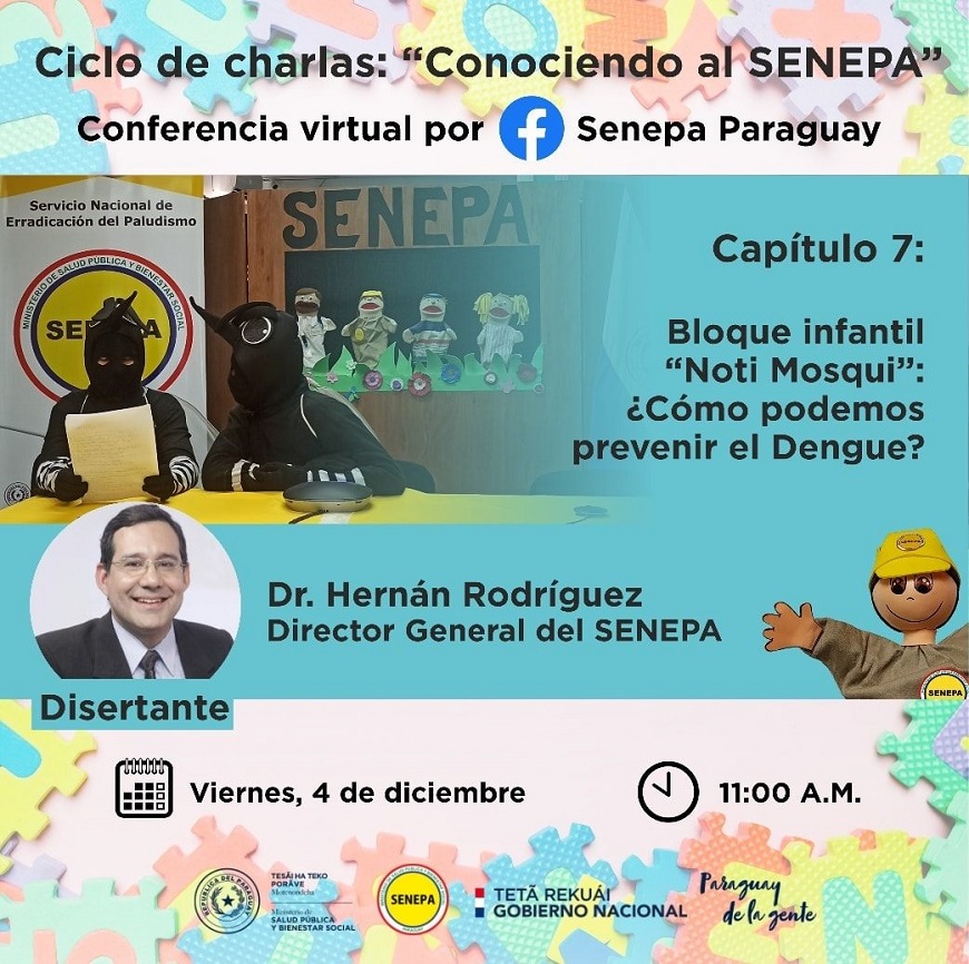Con el fin de involucrar a toda la familia, incluso a los mas pequenos, en la eliminacion de criaderos del Aedes aegypti, y dentro del marco del ciclo de charlas "Conociendo al SENEPA", emitiran el primer bloque infantil â€Å“Noti Mosquiâ€. El bloque sera transmitido a las 11:00, del viernes 4 de diciembre, en el siguiente link: https://www.facebook.com/senepaparaguay Esta dirigido a ninos de 3 a 10 anos de edad y a todos los que quieran sumarse a un espacio de aprendizaje divertido y dinamico que, en la ocasion, realizara una introduccion al tema Dengue, como se transmite, las caracteristicas del mosquito, como ayudar a la familia con la eliminacion de criaderos y que hacer ante la presencia de sintomas. El disertante sera el propio director del Servicio Nacional de Erradicacion del Paludismo (SENEPA), Dr. Hernan Rodriguez. La iniciativa surge de la importancia de empoderar a toda la familia y a la ciudadania en el conocimiento acerca del mosquito transmisor del Dengue y otras enfermedades, el Aedes aegypti. Se pretende emitir el bloque â€Å“Noti Mosqui†al menos una vez al mes, durante las vacaciones de verano y en las de invierno. Es importante inculcar el habito de la eliminacion de criaderos y la informacion para la prevencion a lo largo de la vida. Â