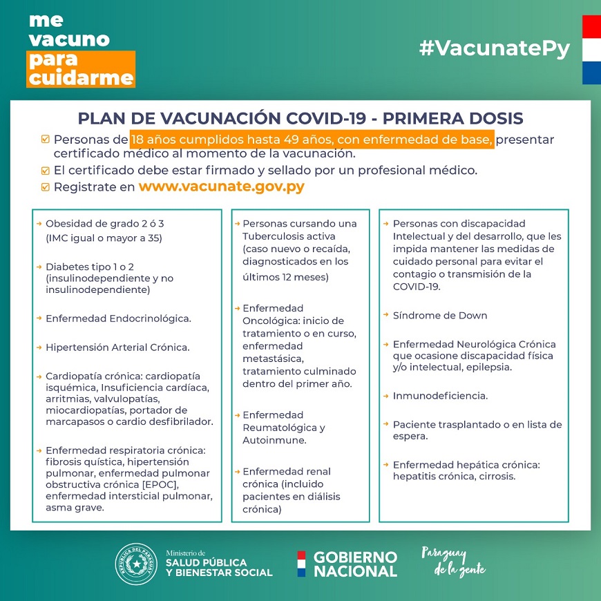 Hoy, sabado 3 de julio, arranca la segunda etapa del Plan Nacional de Vacunacion contra COVID-19, aplicando primeras dosis a la poblacion de 18 a 49 anos de edad con enfermedad de base. En esta jornada, corresponde la aplicacion de anticovid a quienes tengan terminacion de cedula de identidad â€Å“0†al â€Å“4†y, manana domingo, corresponde a las personas con terminacion de cedula â€Å“5†al â€Å“9â€. El listado de los vacunatorios habilitados para el efecto se encuentra disponible para su descarga en www.vacunate.gov.py, plataforma en la cual tambien deben registrarse para acceder a las dosis. El requisito fundamental es presentar el certificado medico original que indique su enfermedad de base, firmado y sellado por un profesional medico. No es necesario que el certificado este visado por la Direccion de Control de Profesiones, dependiente del Ministerio de Salud. Es importante recordar que, si al momento del registro, no marco, por error, que padece de una enfermedad de base, puede solicitar la rectificacion del registro al correo consultasvacunate@mspbs.gov.py A continuacion, un listado de las enfermedades consideradas de base: - Obesidad de grado 2 o 3 (IMC igual o mayor a 35). - Diabetes tipo 1 o 2 (insulinodependiente y no insulinodependiente). - Enfermedad Endocrinologica. - Hipertension Arterial Cronica. - Cardiopatia cronica: cardiopatia isquemica, Insuficiencia cardiaca, arritmias, valvulopatias, miocardiopatias, portador de marcapasos o cardio desfibrilador. - Enfermedad respiratoria cronica: fibrosis quistica, hipertension pulmonar, enfermedad pulmonar obstructiva cronica [EPOC], enfermedad intersticial pulmonar, asma grave. - Personas cursando una Tuberculosis activa (caso nuevo o recaida, diagnosticados en los ultimos 12 meses). - Enfermedad Oncologica: inicio de tratamiento o en curso, enfermedad metastasica, tratamiento culminado dentro del primer ano. - Enfermedad Reumatologica y Autoinmune. - Enfermedad renal cronica (incluidos pacientes en dialisis cronica) - Personas con discapacidad Intelectual y del desarrollo, que les impida mantener las medidas de cuidado personal para evitar el contagio o transmision de COVID-19. - Sindrome de Down. - Enfermedad Neurologica Cronica que ocasione discapacidad fisica y/o intelectual. - Inmunodeficiencia. - Paciente trasplantado o en lista de espera. - Enfermedad hepatica cronica: hepatitis cronica, cirrosis. Habilitados para vacunacion primera dosis y pendientes de la misma Aquellas personas pendientes de vacunacion que ya esten habilitadas podran recurrir a los vacunatorios del lunes 5 hasta el miercoles 7 de julio. No se tendra en cuenta la terminacion de cedula de identidad y abarca a todas las personas de 18 a 49 anos de edad con enfermedad de base, y las de 50 anos cumplidos en adelante.
