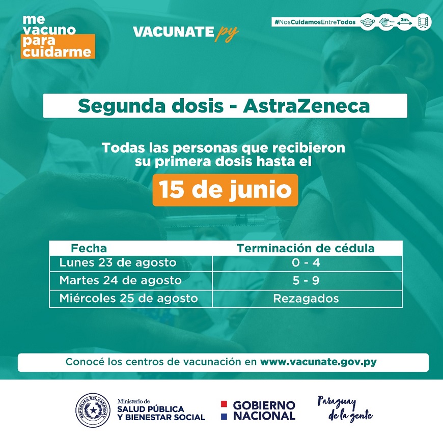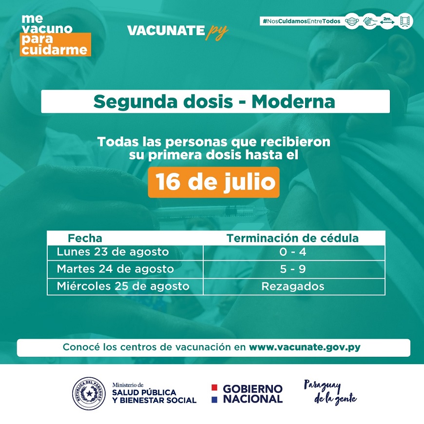 El Plan Nacional de Vacunacion, previsto para la segunda dosis de Moderna y AstraZeneca en el pais, seguira los dias lunes 23, martes 24 y miercoles 25 de agosto, para las personas que recibieron su primera dosis de Moderna hasta el 16 de julio y de AstraZeneca hasta el 15 de junio. El calendario de vacunacion sera por terminacion de C.I. para Moderna y AstraZeneca, de la siguiente manera: Lunes 23 de agosto: 0 a 4 Martes 24 de agosto: 5 a 9 Miercoles 25 de agosto: Rezagados Es importante recordar que las personas deben llevar la tarjeta de vacunacion, de manera a agilizar el trabajo de los vacunadores. Para conocer los centros vacunatorios disponibles y sus horarios, ingrese a www.vacunate.gov.py, boton "centros de vacunacion".  Asi tambien, se insiste a las personas a seguir manteniendo las medidas sanitarias de prevencion y proteccion contra COVID-19, como el lavado frecuente de manos, uso de tapabocas, distanciamiento fisico, ventilacion de espacios cerrados, entre otras.