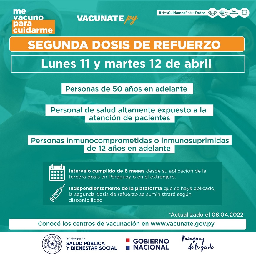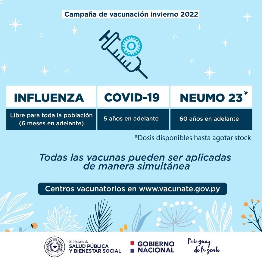 Estarán disponibles las dosis contra influenza, para toda la población desde los 6 meses de vida en adelante, así como las anticovid para personas de 5 y más años de edad y la vacuna contra el neumococo, dirigida a adultos de 60 años en adelante.Se avanzará con la aplicación de la segunda dosis de refuerzo contra COVID-19 a adultos mayores, a partir de 50 años de edad, a personal de salud altamente expuesto al virus por la atención de pacientes y a personas inmunocomprometidas o inmunosuprimidas (12 años de edad en adelante), quienes hayan cumplido seis meses desde la aplicación de la tercera dosis en Paraguay o en el extranjero.