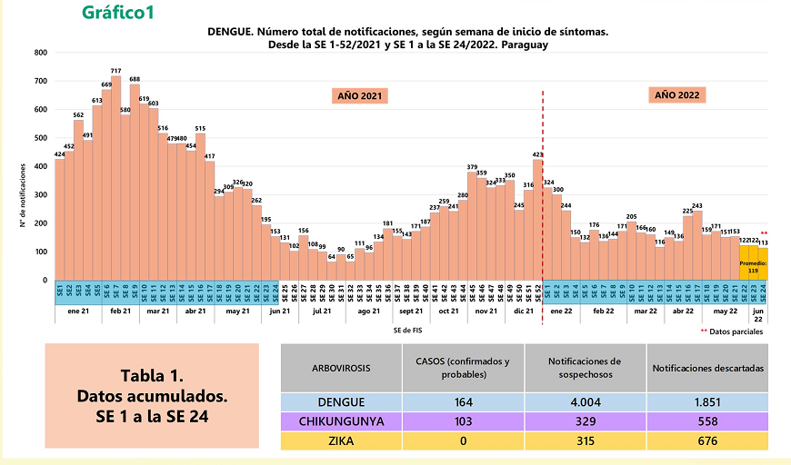 En las ultimas tres semanas, se contabiliza un promedio de 119 notificaciones de cuadros sospechosos de dengue y 51 sospechas de chikungunya. Central y Canindeyu figuran entre los departamentos con mas notificaciones de dengue. En lo que respecta a chikungunya, el mayor numero de notificaciones se concentra en el departamento Central.