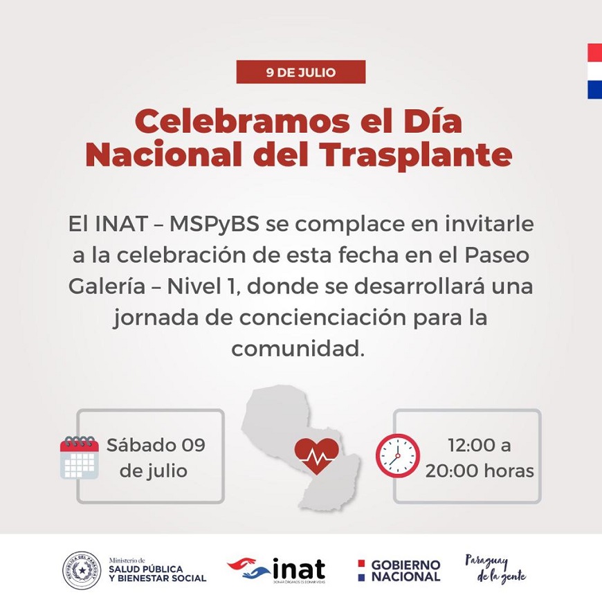 En el marco del â€Å“Dia Nacional del Trasplanteâ€, que se conmemora cada 9 de julio, en esa fecha, el Ministerio de Salud Publica y Bienestar Social, a traves del Instituto Nacional de Ablacion y Trasplante (INAT), realizara un acto para concienciar sobre la importancia de donar organos. En la ocasion, pacientes trasplantados daran su testimonio. Al respecto, el Dr. Gustavo Melgarejo, director del INAT, senala que la idea es promover y concienciar sobre la donacion de organos y tejidos, â€Å“queremos darle un sentido humano y hablar de una realidad del que aquel que nunca lo paso jamas podra dimensionarâ€, indica el Dr. Melgarejo.  El acto que convoca a la comunidad en su conjunto se desarrollara e en el nivel 1, del shopping Paseo La Galeria, de 12:00 a 20:00. Cabe senalar que, debido a que el mensaje principal es el agradecimiento a los donantes de organos, durante la jornada se compartiran las experiencias de las personas que recibieron un trasplante, y que brindan su gratitud a los donantes anonimos que les otorgaron una nueva oportunidad de vida. Tambien se suman mensajes de quienes trabajan dia a dia en el sistema de salud en los procesos de los trasplantes. Algunos de los testimonios - Tatiana Benitez, de San Lorenzo: recibio trasplante de corazon a los 6 anos, hace 15 anos. - Diego Vera, de 41 anos de edad: estuvo al borde de la muerte luego de una puncion irregular de uno de sus rinones, por lo que debio recibir un trasplante. La cirugia fue un exito, hace 11 anos. - Luz Salinas, 21 anos de edad: oriunda de San Ignacio, Misiones, fue beneficiada con un trasplante de rinon el 8 de diciembre de 2016. Hace casi seis anos de aquel dia. - Alberto Lopez, de 48 anos de edad: trasplantado cardiaco, fue beneficiado con una donacion hace casi cuatro anos. Para ser donante Actualmente, ya no es necesario registrarse como donante de organos y/o tejidos (se exceptua del mismo donante para C.P.H.), ya que, a traves de la Ley Nº 6.170/18, todos fuimos declarados presuntos donantes. De igual manera, si la persona gusta dejar expresa su voluntad de ser donante, se encuentra disponible el formulario de inscripcion, el cual debe completar, firmar y luego remitir por correo a inatpy@gmail.com, anexando la fotocopia o la foto de su cedula de identidad. Descargar el formulario haciendo clic en este link https://www.mspbs.gov.py/inatÂ
