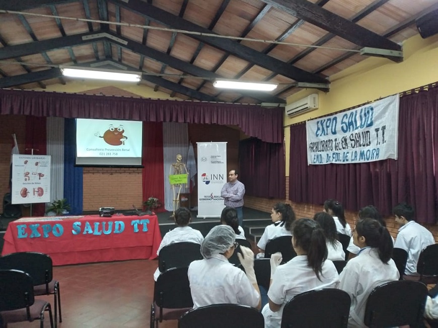 El Instituto Nacional de Nefrologia (INN), a traves del Programa de Salud Renal, realiza la promocion de la salud de los rinones y, en este contexto, lleva a cabo charlas en colegios, con el objetivo de que los jovenes conozcan un poco mas sobre la patologia y las medidas para prevenirla, llevando tambien estos conocimientos a sus hogares. En el marco de la â€Å“Expo Saludâ€, se desarrollaron charlas en el colegio nacional EMD Dr. Fernando de la Mora y en el colegio nacional EMD Juan Ramon Dahlquist, dirigidas a estudiantes de secundaria, padres de familia y autoridades educativas, que fueron abordados de manera general en el tema del rinon, su morfologia, su ubicacion y sus funciones, como asi tambien las enfermedades que pueden afectar al rinon, y como prevenir enfermedades renales. La actividad estuvo a cargo del Dr. Pablo Jara, jefe del Programa de Salud Renal, con apoyo de la Lic. Ãngeles Ãlvarez, jefa del departamento de Asistencia Social, ambas dependientes del INN. Esta enfermedad tambien es catalogada como silenciosa, ya que no produce sintomas hasta que los rinones ya estan danados. Para reducir la frecuencia y el impacto de la enfermedad renal y sus problemas asociados es importante: - Controlar la presion arterial. - Mantener la glicemia (azucar) controlada. - Realizar un chequeo anual de la funcion renal con el nefrologo, sobre todo si es diabetico o hipertenso. - Dejar de fumar y vapear. - Evitar el consumo de bebidas alcoholicas. - Realizar al menos 30 minutos de ejercicio al dia. - Llevar una dieta saludable. - Preferir siempre el agua a bebidas azucaradas. - No automedicarse con analgesicos u otros farmacos que parecen inofensivos, sin embargo, pueden afectar la funcion renal. Indicios de padecer alguna enfermedad renal - Anemia persistente no explicada por otras causas. - Prurito (picazon) sin causa clara. - Disminucion de la orina o que la misma sea muy clara o espumosa. - Edemas o hinchazon. - Hematuria (orina con sangre) - Sensacion de falta de aire sin causa clara. - Mal gusto en la boca. - Nauseas, sobre todo por la manana, disminucion del apetito o perdida de peso sin causa aparente. - Hipoglicemias, presion arterial no controlada. - Disminucion de la agudeza visual.