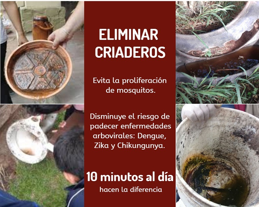 Una minima cantidad de agua es suficiente para que el mosquito transmisor de estas enfermedades pueda depositar sus huevos y multiplicarse. No se reproduce en la basura comun (residuos domiciliarios), sino en objetos en desuso (sin importar el tamano) y en recipientes con agua; pueden ser tapitas, envases, cubetas, tambores, neumaticos, inodoros, electrodomesticos inservibles y otros que tengan capacidad para acumular agua. Por eso, es importante desechar todo objeto en desuso que acumule agua. Aquellos objetos inservibles que no puedan desecharse, deben colocarse bajo techo o cubrirse, de forma a evitar que acumulen agua. Tambores o recipientes con agua que sera utilizada deben mantenerse hermeticamente tapados. Asimismo, se indica cambiar a diario el agua de los floreros, para evitar que se conviertan en criaderos, previa higiene del recipiente, con cepillo, agua y jabon, ademas de realizar limpieza de las raices y el tallo. Si es posible, es aconsejable reemplazar el agua del florero por tierra. Es igualmente importante desechar el agua acumulada en platos de macetas/planteras. Esta practica se debe realizar durante todo el ano, pues constituye la principal medida para mitigar las enfermedades transmitidas por el Aedes aegypti, mosquito que se encuentra preferentemente en ambientes urbanos; la hembra es la que se alimenta de sangre humana para madurar sus huevos, los cuales deposita en las paredes de recipientes con agua estancada, conocidos como â€Å“criaderosâ€. Estos huevos se rompen en contacto con el agua, dando lugar a las larvas, que se transforman en pupas para, finalmente, convertirse en mosquito adulto. Este proceso se desarrolla durante siete dias, aproximadamente. El mosquito adulto vive, en promedio, treinta dias. Invertir 10 minutos diarios en la busqueda y eliminacion de potenciales criaderos de mosquitos hace la diferencia. Es una manera efectiva de proteccion para toda la familia.