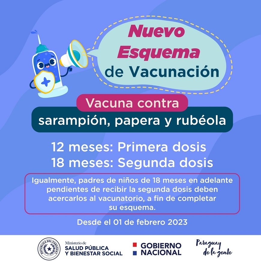 Por iniciativa del Programa Ampliado de Inmunizaciones, y tras aprobacion del Comite Tecnico Nacional Asesor de Inmunizaciones (COTENAI), nuestro pais ha decidido implementar la actualizacion del esquema de vacunacion correspondiente a la triple viral o SPR (sarampion, papera y rubeola), reduciendo el intervalo de vacunacion, para la segunda dosis, de 4 anos a 18 meses de edad. Desde el mes de febrero de 2023, el esquema de vacunacion se ejecutara de la siguiente manera: El nino o nina debe recibir su primera dosis de la vacuna SPR a los 12 meses de vida; y la segunda dosis a los 18 meses. Esta modificacion regira para los ninos y ninas nacidos en agosto del 2021. En cuanto a los ninos y ninas nacidos previamente a agosto de 2021, para la administracion de la segunda dosis de la vacuna triple viral SPR, se debera respetar el intervalo minimo de cuatro semanas entre las dos dosis. Igualmente, padres de ninos de 18 meses en adelante pendientes de recibir la segunda dosis deben acercarlos al vacunatorio, a fin de completar su esquema. Autoridades sanitarias instan a padres y encargados a completar el esquema regular de vacunacion de los ninos y ninas, de manera a protegerlos de enfermedades peligrosas y contagiosas como el sarampion. Tambien, se recomienda a los viajeros estar inmunizados contra esta enfermedad. Que es el Sarampion El sarampion es una de las enfermedades mas contagiosas, puede transmitirse a traves de la tos y los estornudos. Las personas pueden contagiarse al respirar el aire contaminado con el virus o si tocan una superficie contaminada y luego se tocan los ojos, la nariz o la boca, afecta principalmente a los ninos, ninas y personas no vacunadas, puede complicarse y producir neumonia, infeccion del cerebro y la muerte.