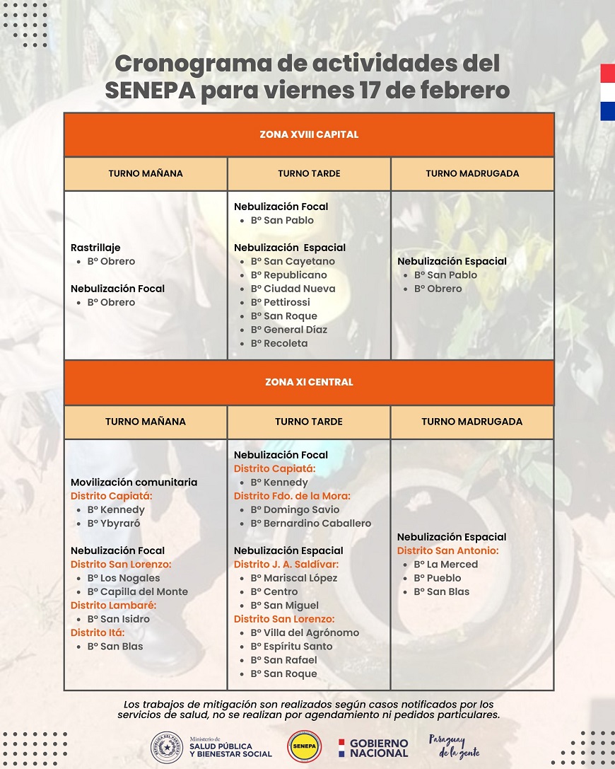 El compromiso y la accion de cada ciudadano para eliminar objetos que puedan acumular agua y servir de criadero de mosquitos es fundamental, en especial despues de las lluvias, para mitigar el impacto del chikungunya, dengue y Zika. Ademas de la verificacion de entornos por 10 minutos, diariamente, se recomienda utilizar repelente para actividades al aire libre y, para el interior de los domicilios, mosquiteros y tela metalica en puertas y ventanas. El Ministerio de Salud Publica y Bienestar Social, a traves del Servicio Nacional de Erradicacion de Paludismo (SENEPA), continua con las intervenciones en barrios de Asuncion y en distritos del departamento Central, asi como en otras zonas del pais desde las zonas operativas. El cronograma tentativo para distintos barrios capitalinos y distritos de Central abarca desde hoy hasta el martes 21 de febrero, en turnos manana, tarde y madrugada, con la realizacion de mingas ambientales y nebulizaciones focales y espaciales. Se resalta que las actividades y areas de cobertura podrian sufrir modificaciones de acuerdo con la situacion epidemiologica que se presente o por inclemencia climatica. ¿Que distritos seran intervenidos en esta ocasion? - Lambare. - Capiata. - San Lorenzo. - San Antonio. - Aregua. - Ypane. - nemby. - J. Augusto Saldivar. - Ita. - Fernando de la Mora. Descargue el itinerario en el siguiente link: https://www.mspbs.gov.py/dependencias/portal/adjunto/94c975-CRONOGRAMADEACTIVIDADESDEL17AL21.pdf ¿Como puede ayudar? - Aquellos objetos inservibles que no puedan desecharse, como aparatos domesticos, neumaticos u otros, deben colocarse bajo techo o cubrirse, de forma a evitar la acumulacion de agua. - Realizar agujeros a las latas para evitar que acumulen agua. - Los inodoros en desuso depositados en el patio pueden rellenarse con tierra, y usarlos como planteras. - Tapar tanques y tambores con agua que sera utilizada. - Clorar las piscinas para impedir la reproduccion de mosquitos. - Cambiar a diario el agua del bebedero de los animales, previa higiene con cepillo, agua y jabon, a los efectos de eliminar posibles huevos que hayan quedado adheridos en las paredes del recipiente. - Eliminar con la basura envases y objetos en desuso que puedan estancar agua (tapitas, botellas, etc.) y cuidar que no se acumule basura en el interior de los registros, de manera que el agua este drenada.