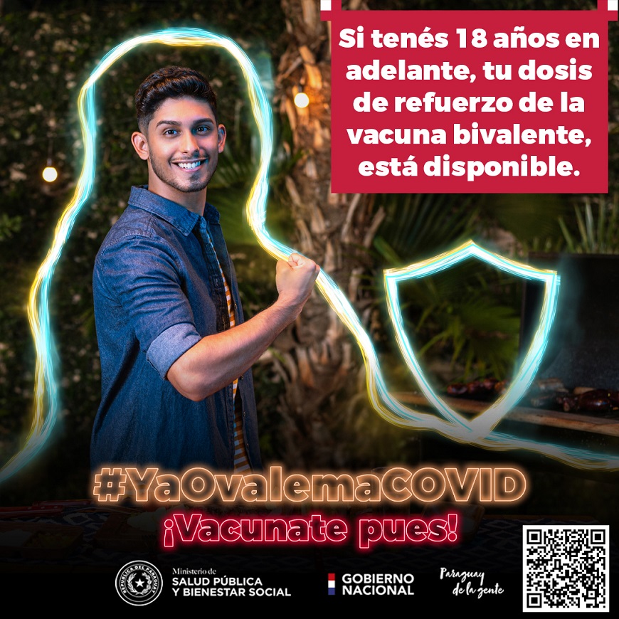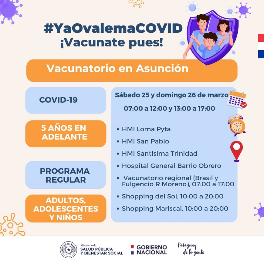 Ademas de insistir con la inmunizacion para estar protegidos contra SARS-CoV2, la cartera sanitaria recuerda la importancia de los cuidados para prevenir contagios de enfermedades respiratorias. Cabe recordar que es determinante tener completo el esquema de vacunacion contra COVID-19. La antiCOVID-19 se aplica a personas de 5 anos de edad en adelante. Igualmente, esta disponible la dosis anual de la bivalente para las personas de 18 anos en adelante (a partir del 10 de abril a personas de 12 anos en adelante) que hayan completado el esquema primario (primera y segunda dosis), tras haber transcurrido cuatro meses de la 2° aplicacion. Si recibio el primer o segundo refuerzo, deben transcurrir seis meses para recibir esta vacuna. De igual manera, en el caso de las embarazadas con 18 anos o mas, habiendo cumplido 12 semanas de gestacion, podran recibir la vacuna, con indicacion medica, mediante un certificado medico firmado y sellado por el profesional. Cabe recordar que la dosis bivalente protege al cuerpo contra dos tipos de variantes (Wuhan y Ómicron). Desde el inicio de la inmunizacion contra COVID-19 con la dosis anual de la bivalente, se han inmunizado a mas de 60.000 personas hasta la fecha en nuestro pais. #YaOvalemaCOVID, ¡Vacunate pues! Continua por todo el mes de marzo la campana #YaOvalemaCOVID, ¡Vacunate pues!, en el Shopping Mariscal y Shopping Del Sol, ubicados en Asuncion, habilitando la jornada de vacunacion de 10:00 a 20:00, asi como en Abasto Norte, ubicado en Limpio, desde las 08:00 hasta las 15:00, de lunes a domingo. Vacunacion fin de semana en Asuncion Sabado 25 y domingo 26 de marzo, de 07:00 a 12:00 y de 13:00 a 17:00, aplicaran la anticovid en los vacunatorios de los siguientes establecimientos: - Hospital materno infantil de Loma Pytã. - Hospital materno infantil de Santisima Trinidad. - Hospital general Barrio Obrero. - Hospital general materno infantil San Pablo (edificio nuevo).  - Vacunatorio regional (Brasil casi Fulgencio R. Moreno). - Shopping del Sol (10:00 a 20:00). - Shopping Mariscal (10:00 a 20:00). Esquema de vacunacion contra Covid-19: Primera dosis: • Coronavac, para personas de 5 anos en adelante. • Sinopharm, personas de 18 anos en adelante. Requisitos para vacunacion Covid-19 (no necesario para el esquema regular): Ninas, ninos y adolescentes de (5 a 17 anos) deben ir acompanados por uno de sus padres o tutor legal, presentar cedula de identidad del adulto y nino, nina o adolescente, fotocopia del certificado de nacimiento o libreta de familia, o fotocopia de la resolucion judicial, en el caso del tutor o guarda temporal. Si no se cuenta con la partida de nacimiento o alguna documentacion que respalde la filiacion, el acompanante mayor de edad podra firmar una declaracion jurada que certifique la filiacion o el grado de parentesco con el adolescente (con la fotocopia de cedula del adulto y del adolescente). El modelo de esta declaracion jurada se puede descargar de: https:/www.vacunate.gov.py/index-modelo-certificados.html Segunda dosis: Dirigida a todas las personas de 5 anos de edad en adelante, que hayan cumplido el intervalo minimo de vacunacion, segun plataforma recibida, desde la aplicacion de la primera dosis: • Coronavac: 4 semanas. • Sinopharm: 4 semanas. Personas vacunadas en el exterior. Para la planificacion correspondiente, se debe: 1- Ingresar a www.vacunate.gov.py y registrarse en el apartado "vacunados en el exterior". Una vez registrados sus datos, seran validados por el Programa Ampliado de Inmunizacion, en un plazo de 24 horas en adelante, siguiendo el Plan Nacional de vacunacion contra COVID-19 y dependiendo de la disponibilidad de la vacuna solicitada. 2- Verificar si se encuentra habilitado. Ingresar nuevamente a www.vacunate.gov.py y acceder al apartado CONSULTAR REGISTRO y, luego, VACUNADOS EN EL EXTERIOR. Cuando figure la palabra HABILITADO, podran acudir al vacunatorio designado en la Region Sanitaria. 3- Una vez habilitadas, podran acceder a la tercera dosis. Las vacunas nos protegen, son confiables y son gratuitas. Acercate a un vacunatorio y cumple con tus esquemas de vacunacion. Para conocer el listado de los vacunatorios disponibles, visita el siguiente enlace www.vacunate.gov.py.