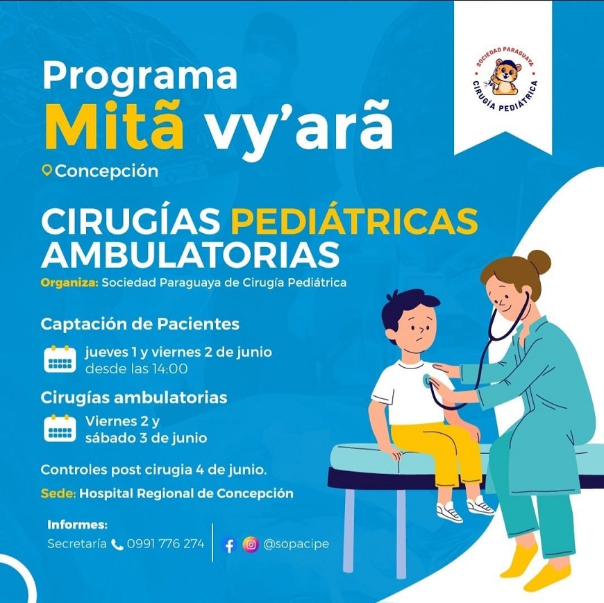 Pacientes pediátricos con hernias, quistes, fimosis y otros casos ambulatorios deberán acercarse al hospital regional, el jueves 1 y viernes 2 de junio próximos.La captación se llevará a cabo a partir de las 14:00, y las cirugías serán programadas para los días 2 y 3 de junio.Para mayor información, llamar al 0991776274, de la Sociedad Paraguaya de Cirugía Pediátrica.