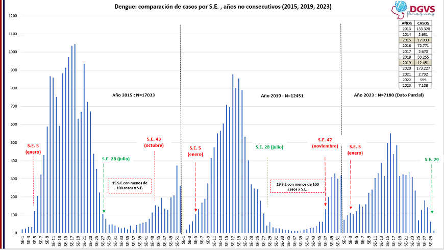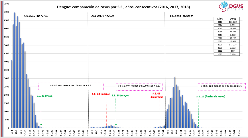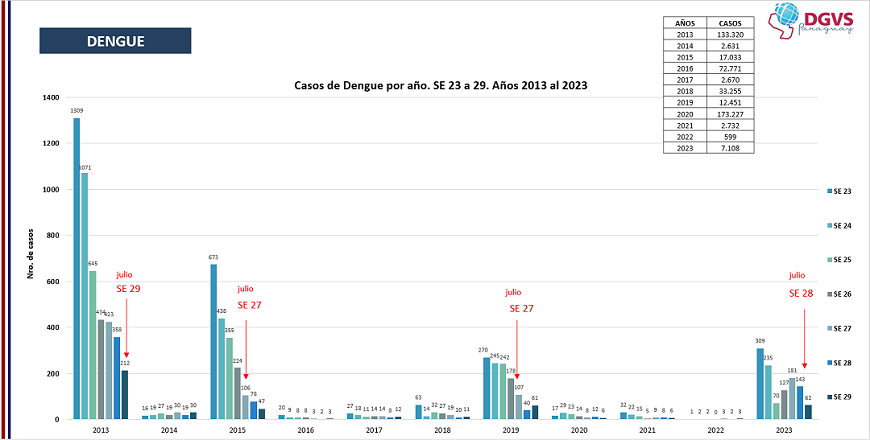 El director general de Vigilancia de la Salud, Guillermo Sequera, senala que el volumen de casos registrados durante el mes de julio advierte el riesgo de un comienzo temprano del periodo epidemico de dengue y chikungunya, y anticipa la llegada de una gran epidemia. Entre los meses de julio y agosto se han registrado varios casos de dengue y chikungunya en el pais, â€Å“no es buen pronosticoâ€, senala el titular de Vigilancia de la Salud. El epidemiologo refiere que este fenomeno ya se dio en epidemias pasadas. â€Å“Mirando los historicos de dengue en Paraguay (en los anos 2013, 2015 y 2019), vimos que, en esos anos, en el mes de julio se registraron casos confirmados (aunque hayan sido pocos), anunciaban que se verian aumentos, asi como un inicio temprano de un nuevo brote o una nueva epidemiaâ€. Esto se vio en el ano 2013, en julio, en la semana epidemiologica (SE) 29 en el que se registraron 212 casos de dengue; en el 2014, tambien en el mes de julio, en la (SE) 27 se contabilizaron 106 casos de dengue; en julio de 2019, en la SE (27) se identificaron 107 casos, y en este ano 2023 se reportaron 143 casos de la enfermedad en la (SE) 28. Sequera sostiene que apenas empiece la temporada de lluvias, entre septiembre y octubre, podrian comenzar a dispararse los cuadros de arbovirosis circulantes en el pais, por lo que se insta a tomar las medidas de prevencion y control, a fin de disminuir el contacto con los vectores. Entre las medidas mas eficaces se encuentra la eliminacion de los criaderos del mosquito Aedes aegypti. Actualmente todos los departamentos del pais registran casos de dengue y chikungunya.