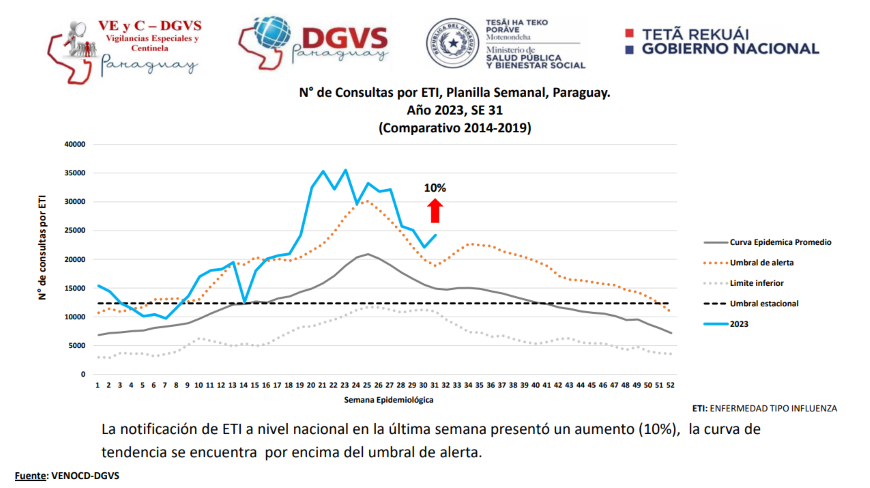 En la ultima semana, se registro un incremento de 10% en la demanda de consultas por enfermedad tipo influenza (ETI) y por infeccion respiratoria aguda no neumonia (IRANN), con relacion a la semana anterior; pasando de 22.038 en la semana epidemiologica (SE) 30 a 24.205 en la (SE) 31. La curva de tendencia se encuentra por encima del umbral de alerta, senala el reporte actualizado del Programa de Vigilancias Especiales y Centinela de la Direccion General de Vigilancia de la Salud. Por otra parte, se registra descenso de consultas por infecciones respiratorias agudas graves (IRAG).