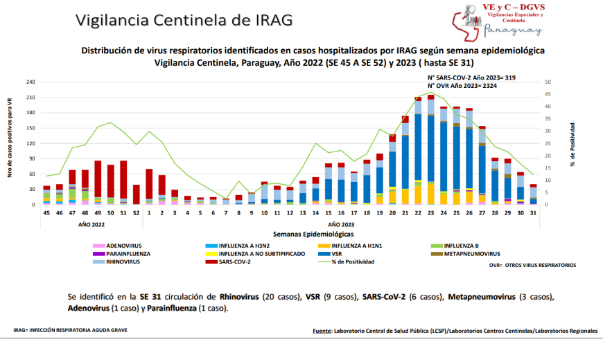 Hasta el momento, los virus circulantes en el pais identificados en la ultima semana evaluada son: Rhinovirus, Virus sincitial respiratorio (VSR), SARS-CoV2, Metapneumovirus, Influenza A H1N1, Influenza B, y Parainfluenza.