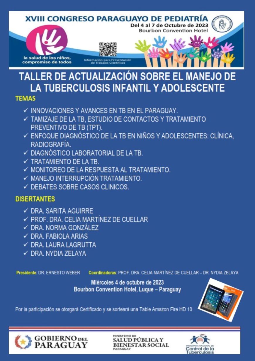 La tuberculosis (TB) sigue constituyendo un problema de salud publica en America Latina y el Caribe, y en el mundo. La Organizacion Mundial de la Salud (OMS) estima que 18.300 ninos y ninas de hasta 15 anos viven con TB en las Americas, pero mas de la mitad carecen de acceso a servicios de diagnostico y tratamiento. Con el objetivo de mejorar esta situacion y lograr que se diagnostique y se trate antes esta enfermedad en dicho grupo de edad, la OMS publico este ano las directrices actualizadas y el manual operativo para el tratamiento de la tuberculosis en ninos, ninas y adolescentes, que incluyen recomendaciones para ampliar las pruebas de diagnostico y el tratamiento, y nuevos modelos de atencion descentralizada e integrada para mejorar el acceso a la atencion y el tratamiento preventivo mas cerca del hogar. Estas nuevas directrices, junto con el manual operativo, seran socializados en el â€Å“Taller de actualizacion sobre manejo de la tuberculosis infantil y adolescenteâ€, encabezado por el Programa Nacional de Control de la Tuberculosis. La actividad se realizara este miercoles, 4 de octubre de 2023, en el Bourbon Convention Hotel, en Luque, en el marco del XVIII Congreso Paraguayo de Pediatria. Se abordara sobre innovaciones y avances de la TB en el Paraguay; tamizaje, estudios de contactos y tratamientos preventivos; enfoque de diagnostico de la tuberculosis en ninos, ninas y adolescentes: clinica y radiografia, entre otros temas. La finalidad del taller es poner a conocimiento respecto a las innovaciones realizadas por el Programa de Tuberculosis de Paraguay; y actualizar sobre los aspectos de prevencion, diagnostico, manejo clinico y programatico de TB en poblacion infantil y adolescente. Es importante mencionar que, se otorgara certificado de participacion.
