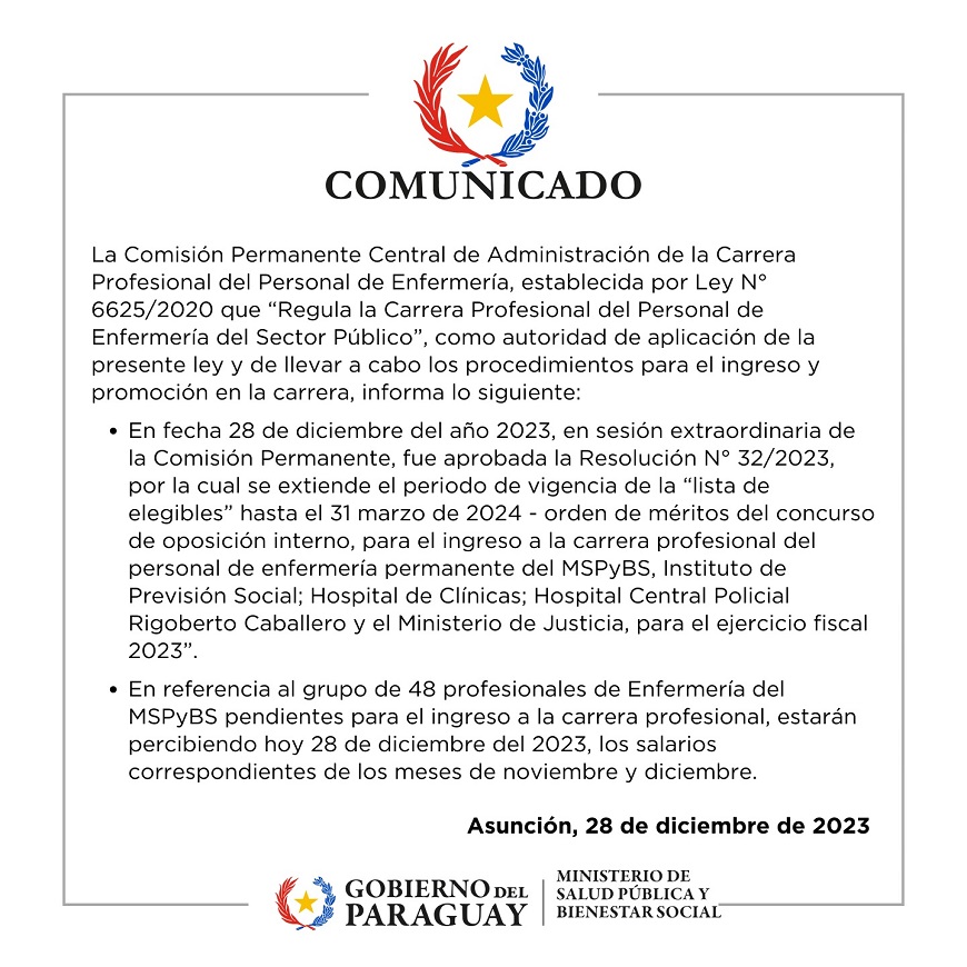 La Comision Permanente Central de Administracion de la Carrera Profesional del Personal de Enfermeria, establecida por Ley N° 6625/2020 que â€Å“Regula la Carrera Profesional del Personal de Enfermeria del Sector Publicoâ€, como autoridad de aplicacion de la presente ley y de llevar a cabo los procedimientos para el ingreso y promocion en la carrera, informa lo siguiente: - En fecha 28 de diciembre del ano 2023, en sesion extraordinaria de la Comision Permanente, fue aprobada la Resolucion N° 32/2023, por la cual se extiende el periodo de vigencia de la â€Å“lista de elegibles†hasta el 31 marzo de 2024 - orden de meritos del concurso de oposicion interno, para el ingreso a la carrera profesional del personal de enfermeria permanente del MSPyBS, Instituto de Prevision Social; Hospital de Clinicas; Hospital Central Policial Rigoberto Caballero y el Ministerio de Justicia, para el ejercicio fiscal 2023â€. - En referencia al grupo de 48 profesionales de Enfermeria del MSPyBS pendientes para el ingreso a la carrera profesional, estaran percibiendo hoy 28 de diciembre del 2023, los salarios correspondientes de los meses de noviembre y diciembre.Â