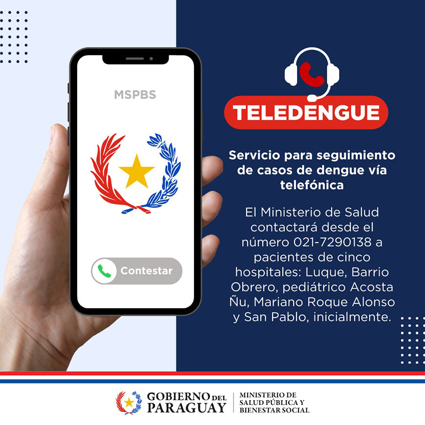 La cartera sanitaria implementa un innovador servicio de seguimiento de casos de dengue via telefonica, denominado "Teledengue". Es un proceso mediante el cual se identifica, evalua y gestiona rapidamente a las personas que han sido asistidas en la red de servicios de salud, con una sospecha de dengue, para monitorear los sintomas de la enfermedad en el periodo critico y contribuir al manejo oportuno de posibles complicaciones.