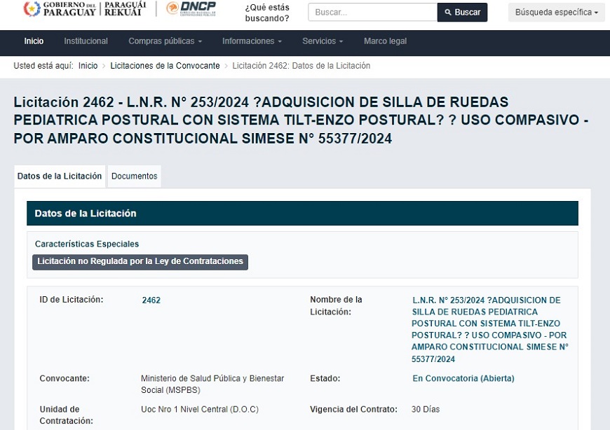 La L.N.R. N° 253/2024 “Adquisición de silla de ruedas pediátrica postural con sistema Tilt-Enzo postural, uso compasivo, por amparo constitucional Simese N° 55377/2024”, se encuentra publicada en el portal de la DNCP. Ver AQUÍ
