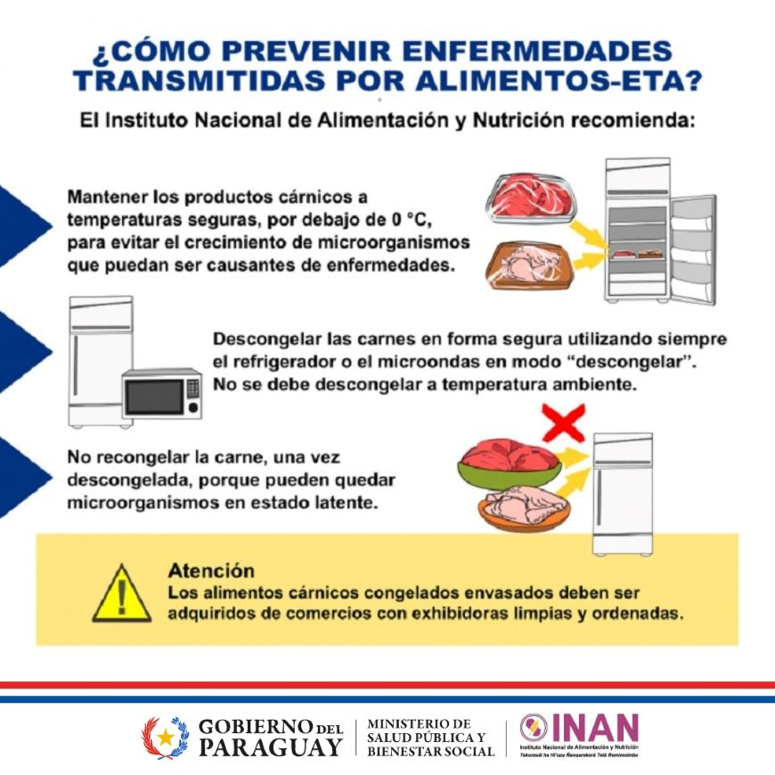 La manipulacion higienica de los alimentos garantiza la inocuidad de los mismos, y previene las enfermedades transmitidas por alimentos (ETA). En este sentido, el Instituto Nacional de Alimentacion y Nutricion (INAN) recomienda aplicar las â€Å“cinco claves para la inocuidad de los alimentos de la Organizacion Mundial de la Salud (OMS)â€, que son mensajes basicos para la preparacion de alimentos inocuos. -Mantener la limpieza. -Separar los alimentos crudos y cocinados. -Cocinar los alimentos completamente. -Mantener los alimentos a temperaturas seguras. -Utilizar agua y alimentos seguros. Asi tambien, emite las siguientes recomendaciones: -Mantener los productos carnicos a temperaturas seguras de 0° a 5°C, para evitar el crecimiento de microorganismos que puedan ser causantes de enfermedades. -Descongelar las carnes en forma segura de 0° a 5°C, utilizando siempre el refrigerador o el microondas en modo â€Å“descongelarâ€. No se debe descongelar a temperatura ambiente. -No recongelar la carne, una vez descongelada, porque pueden quedar microorganismos en estado latente.