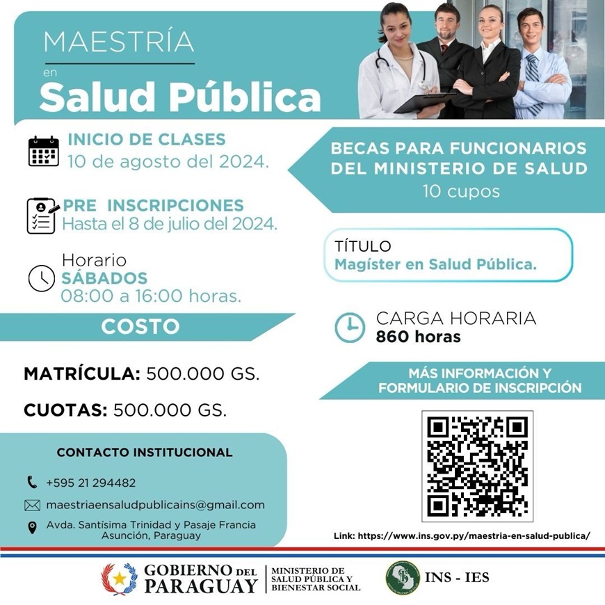 El Ministerio de Salud Publica y Bienestar Social, a traves del Instituto Nacional de Salud ofrece 10 becas a funcionarios del Ministerio de Salud que ocupen cargos de direccion y jefatura de Departamentos, con el apoyo de la Direccion General de Recursos Humanos (DGRRHH) y la Direccion Nacional Estrategica de Recursos Humanos en Salud (DNERHS). La Maestria en Salud Publica es un programa de alto prestigio que busca fortalecer las competencias y habilidades en el sector salud, combinar la investigacion cientifica de alto nivel con el ejercicio profesional y el trabajo en equipos multidisciplinarios, para aportar conocimientos y practicas en la organizacion de las respuestas sociales a la situacion de salud en el proceso salud- enfermedad con enfoque de liderazgo y responsabilidad etica. De esta manera se busca un mejor desempeno en sus funciones y un impacto positivo en la salud publica del pais. Para postularse a la beca acceda al siguiente enlace: https://bit.ly/3RDKZEP Mas sobre la Maestria en Salud Publica El curso esta dirigido especialmente a los profesionales con experiencia en salud publica y/o gestion de servicios sanitarios, por lo que se plantea como criterio preferente la experiencia de al menos cinco anos en estas actividades. Ãreas del Conocimiento al que deben pertenecer los postulantes: Ãrea de la Salud: Medicina; Enfermeria; Obstetricia; Fisioterapia y Kinesiologia; Instrumentacion Quirurgica; Nutricion; Odontologia; Fonoaudiologia y Psicopedagogia.
