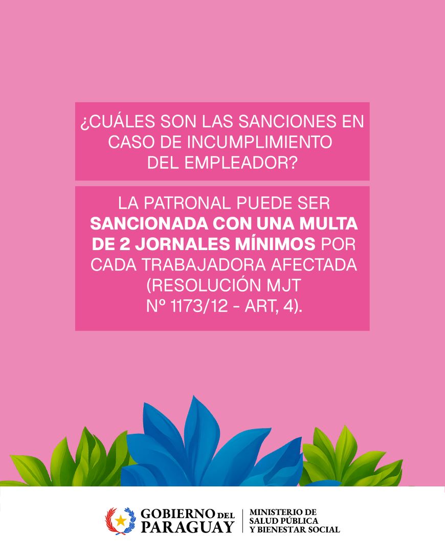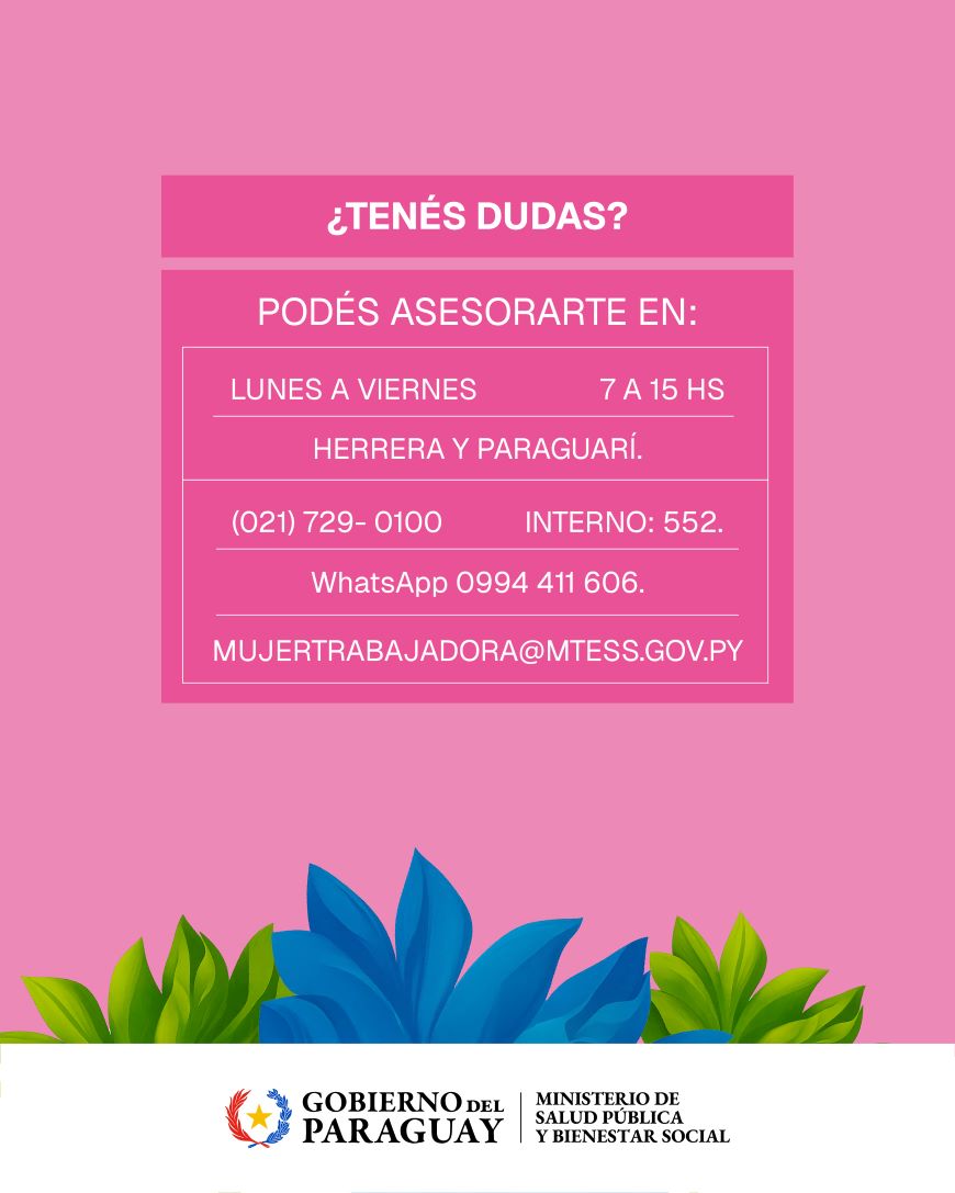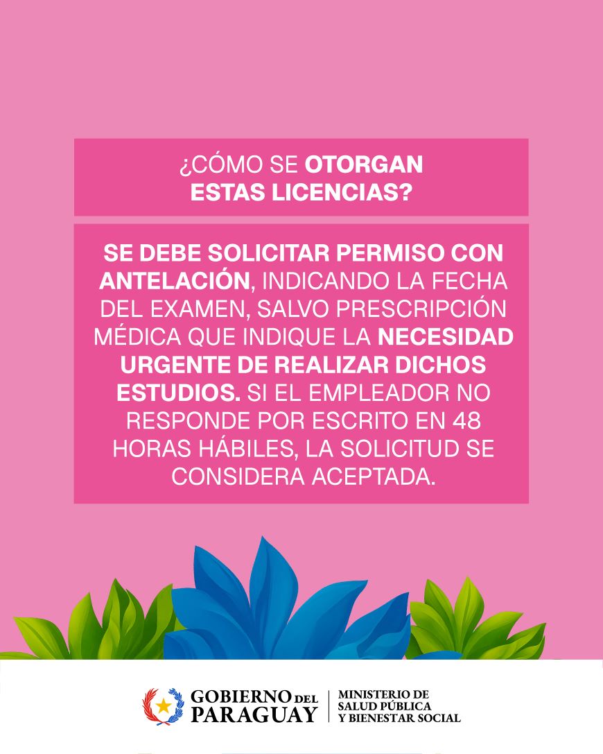 La Ley N.º 6211/18, que modifica el artículo 1° de la Ley N.º 3803/2009, otorga a todas las trabajadoras una licencia remunerada obligatoria de 2 días laborables por año para someterse a exámenes de Papanicolau y mamografía, ampliando así el permiso anual de 1 a 2 días. Este beneficio se da en el marco del Octubre Rosa, dentro de la campaña de prevención del cáncer de mama, impulsada por el gobierno nacional, el Ministerio de Salud Pública y el Ministerio de Trabajo, Empleo y Seguridad Social en forma conjunta. ¿Quiénes son las mujeres beneficiadas? Todas las trabajadoras, dependientes o no, del sector privado o público, con cargo permanente, temporal o contratadas, con cargo electivo o no. ¿Cómo se otorgan estas licencias? La trabajadora debe solicitar permiso con antelación, indicando la fecha del examen. Si el empleador no responde por escrito en 48 horas hábiles, la solicitud se considera aceptada. ¿Cuáles son las sanciones en caso de incumplimiento del empleador? Ante la negativa de usufructo de esta licencia, la patronal puede ser sancionada con una multa de 2 jornales mínimos por cada trabajadora afectada (Resolución MJT Nº 1173/12 - Art. 4). ¿Tenés dudas? El equipo de la Dirección General de Promoción a la Mujer Trabajadora, del Ministerio de Trabajo, Empleo y Seguridad Social, está para asesorarte de lunes a viernes, de 07:00 a 15:00, sito en Herrera esq. Paraguarí. También podés contactar al 021 7290100 interno 551/552 o al correo: mujertrabajadora@mtess.gov.py Jehapejokóguikena Jajapo Peteĩ Jepokuaa. Hagamos de la prevención una tradición Con el lema "Hagamos de la prevención una tradición", el objetivo de la campaña es generar conciencia sobre los controles anuales, para apoyar el aumento del retorno de las mujeres a sus controles médicos y lograr una prevención y detección precoz del cáncer de mama. Desde el MSPYBS se invita a acceder al listado de mamógrafos en todo el país en el siguiente enlace: https://www.mspbs.gov.py/octubre-rosa.html