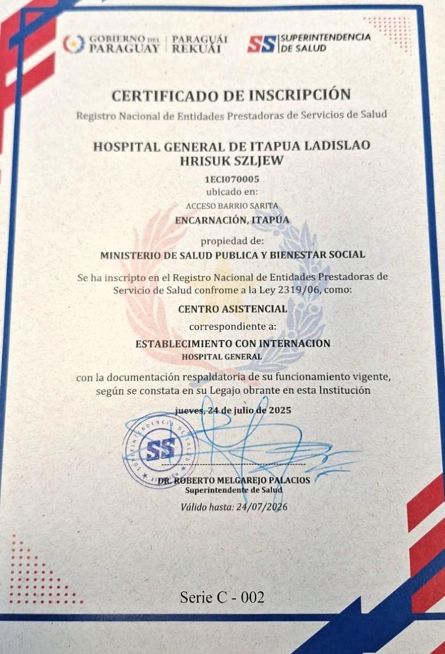 Los hospitales generales de Itapúa y Coronel Oviedo cuentan con habilitación y registro pleno vigente, conforme a lo establecido en la Ley Nº 836/80 "Código Sanitario", y en la Ley N° 2.319/06 que establece las funciones y competencias de la Superintendencia de Salud. Ambos centros fueron habilitados por la Dirección de Establecimientos de Salud, Afines y Tecnología Sanitaria y se hallan inscritos en el Registro Nacional de Entidades Prestadoras de Servicios de Salud, cumpliendo así con todos los requisitos técnicos y legales exigidos para dar tranquilidad a los usuarios de dichos nosocomios. El Hospital General de Coronel Oviedo fue habilitado el 19 de febrero del 2025, inscripto en el Registro Nacional de Entidades Prestadoras de Servicios de Salud el 21 de febrero de 2025 e inaugurado el 24 de febrero. El Hospital General de Itapúa “Ladislao Hrisuk Szljew” obtuvo su habilitación el 23 de julio de 2025 e inscripto en el mismo registro el 24 de julio de 2025, siendo su habilitación operativa un día después. Los certificados fueron otorgados por la Superintendencia de Salud, mientras que las habilitaciones fueron otorgadas por la Dirección de Establecimientos de Salud, Afines y Tecnología Sanitarias. Ambos documentos, acreditan el funcionamiento legal de los establecimientos. Minuciosa evaluación El director de Establecimientos de Salud, Dr. Luis Velázquez, destacó que la habilitación forma parte de los procesos regulares de verificación y control. “Estos hospitales nacieron habilitados. Cada infraestructura, equipo y estructuración médico/administrativa fueron evaluados por varias dependencias del Ministerio de Salud y de Obras Públicas, desde que fueron planificados, durante la ejecución de las obras hasta la conclusión, conforme a los requisitos que regulan los estándares que deben cumplir para obtener la habilitación correspondiente”, explicó. Alta demanda Desde su habilitación, los dos hospitales han mantenido altos niveles de atención. El Hospital de Coronel Oviedo supera las 160.000 consultas médicas y 3.600 cirugías; mientras que, el Hospital General de Itapúa superó las 56.000 atenciones en los primeros 75 días, apoyado en el Sistema de Información en Salud (HIS) que agiliza los procesos de registro clínico. Estos resultados reflejan la confianza de la población en los hospitales y evidencian la plena operatividad y legalidad de los nuevos hospitales, pilares del plan nacional de fortalecimiento de la red pública de salud impulsado por el Gobierno del Paraguay.