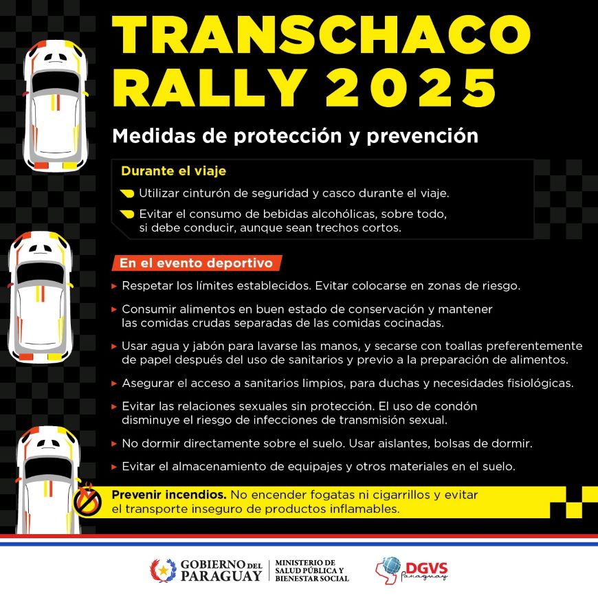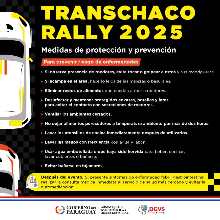 El Ministerio de Salud Pública, a través de la Dirección General de Vigilancia de la Salud, señala una serie de medidas para preservar la salud y prevenir incidentes durante el desarrollo del Transchaco Rally 2025, que se llevará a cabo del 24 al 26 de octubre. Se recomienda a todas las personas que asistirán al evento deportivo: Llevar •Agua potable o potabilizada. •Alimentos en recipientes bien tapados y con capacidad de conservación. •Artículos de limpieza: jabones, detergentes, guantes de goma, rociadores que contengan solución de agua + lavandina. •Tapabocas. •Repelente y ropa apropiada para evitar picaduras de insectos. Personas con enfermedades crónicas: deben llevar las dosis suficientes de sus medicamentos y números telefónicos de contactos accesibles. Durante el viaje •Utilizar cinturón de seguridad y casco durante el viaje. •Evitar el consumo de bebidas alcohólicas, sobre todo si debe conducir, aunque sean trechos cortos. En el evento deportivo •Respetar los límites establecidos. Evitar colocarse en zonas de riesgo. •No dormir directamente sobre el suelo. Usar aislantes, bolsas de dormir. •Evitar el almacenamiento de equipajes y otros materiales en el suelo. •Evitar las relaciones sexuales sin protección. El uso de condón disminuye el riesgo de infecciones de transmisión sexual. •Consumir alimentos en buen estado de conservación y mantener las comidas crudas separadas de las comidas cocinadas. •Asegurar el acceso a sanitarios limpios, para duchas y necesidades fisiológicas. •Usar agua y jabón para lavarse las manos y secarse con toallas, preferentemente de papel, después del uso de sanitarios y previo a la preparación de alimentos. Prevenir incendios: no encender fogatas ni cigarrillos y evitar el transporte inseguro de productos inflamables. Ante urgencias médicas: solicitar ambulancia al 141, desde celular o línea baja. Para prevenir el riesgo de enfermedades •Si observa presencia de roedores, evitar tocar o golpear a estos y sus madrigueras. •Si acampa en el área, hacerlo lejos de las malezas o basurales. •Eliminar restos de alimentos que puedan atraer a roedores. •Desinfectar y mantener protegidos envases, botellas y latas para evitar el contacto con secreciones de roedores. •Evitar el contacto con murciélagos para prevenir accidentes. Si encuentra uno en el suelo, no lo toque, es probable que esté enfermo. •Ventilar los ambientes cerrados. •No dejar alimentos perecederos a temperatura ambiente por más de dos horas. •Lavar los utensilios de cocina inmediatamente después de utilizarlos. •Lavar las manos con frecuencia con agua y jabón. •Usar agua embotellada o que haya sido hervida para beber, cocinar, lavar cubiertos o bañarse. •Evitar bañarse en tajamares. Después del evento Si presenta síntomas de enfermedad febril, eruptiva, gastrointestinal u otro malestar, evitar la automedicación y buscar atención médica oportuna acudiendo al servicio de salud más cercano.