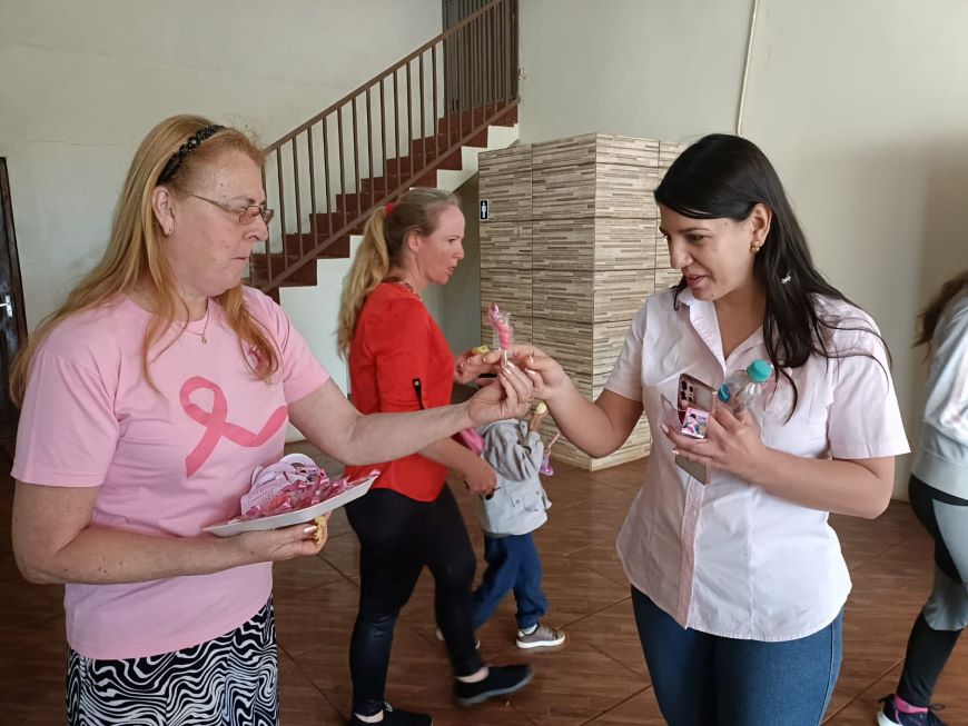 En el marco de la campaña Octubre Rosa, profesionales de salud de la X Región Sanitaria – Alto Paraná brindaron atención médica en la localidad de San Alberto en una jornada dirigida a mujeres con el objetivo de promover la prevención y detección temprana del cáncer de mama y cuello uterino. Las mujeres accedieron a una amplia gama de servicios, entre ellos consultorio médico, vacunación, estudios de PAP y VPH, ecografías de mama, abdominales y obstétricas, atención en nutrición, psicología, mastología, promoción y prevención de la salud. Durante la jornada se realizaron 95 ecografías (53 mamarias, 40 abdominales y 2 obstétricas), 42 estudios de laboratorio, 65 consultas clínicas, 22 pruebas de Papanicolaou, 9 de VPH, 10 consultas nutricionales, 2 psicológicas y se dispensaron 62 medicamentos desde la farmacia. También se concretó la entrega de 70 cestas básicas a familias de la comunidad. Como parte del componente educativo de la iniciativa, se entregaron kits de primeros auxilios a los directores de colegios y escuelas del distrito, fortaleciendo las capacidades locales de respuesta ante emergencias menores. La actividad tuvo lugar en el salón parroquial de la iglesia San Alberto Magno con la presencia de la directora del puesto de salud local, Dra. Amanda Ovelar, y, además, contó con el apoyo de instituciones locales y departamentales. Las autoridades destacaron el compromiso conjunto entre instituciones locales y departamentales para acercar servicios esenciales a la población y fomentar el cuidado de la salud preventiva.