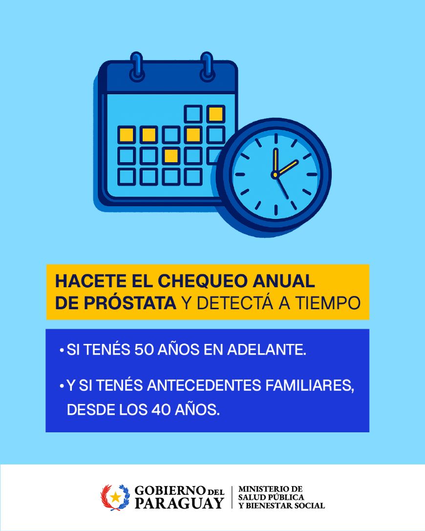 El cáncer de próstata es el cáncer más común en hombres. Es una enfermedad silenciosa en sus primeras etapas, lo que hace aún más importante detectarla a tiempo, antes de que aparezcan síntomas. Es de suma importancia que los hombres acudan al urólogo para realizarse el control oportuno, a partir de los 50 años y, en caso de que existan antecedentes familiares de cáncer de próstata, los controles deben iniciarse a los 40 años, porque estadísticamente existe mayor posibilidad de contraerlo cuando hay familiares directos con la enfermedad. Control integral y orientación médica El cuidado de la próstata debe realizarse con el acompañamiento de un urólogo o médico de confianza, quien podrá indicar los estudios necesarios, interpretar los resultados del PSA y orientar sobre las mejores medidas de seguimiento. Un control médico regular es esencial para mantener una buena salud prostática y detectar cualquier alteración a tiempo. PSA: una herramienta clave en la detección precoz El Antígeno Prostático Específico (PSA) es un análisis de sangre sencillo que permite detectar alteraciones en la glándula prostática antes de que aparezcan síntomas. Se recomienda realizar este estudio una vez al año a partir de los 50 años, o desde los 40 años si existen antecedentes familiares de cáncer de próstata, ya que el riesgo aumenta significativamente en estos casos. Este simple control anual permite descubrir la enfermedad en una fase en la que aún es tratable, y se cuenta con el beneficio de licencia remunerada para chequeos según la Ley Nº 6.280/19, artículo 13, que establece que todos los trabajadores en Paraguay tienen derecho a dos días laborales con goce de sueldo para realizarse exámenes preventivos de cáncer de próstata y colon. El cáncer de próstata no espera. "Hagamos de la prevención una tradición"