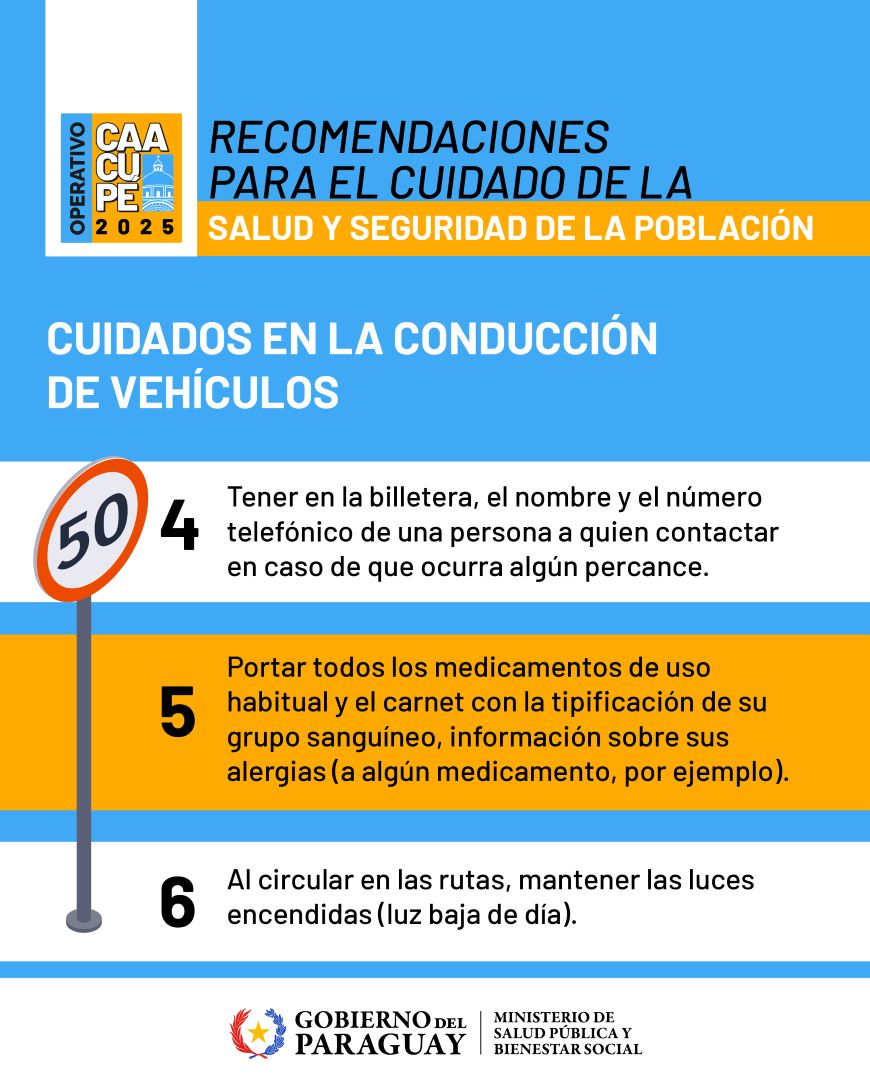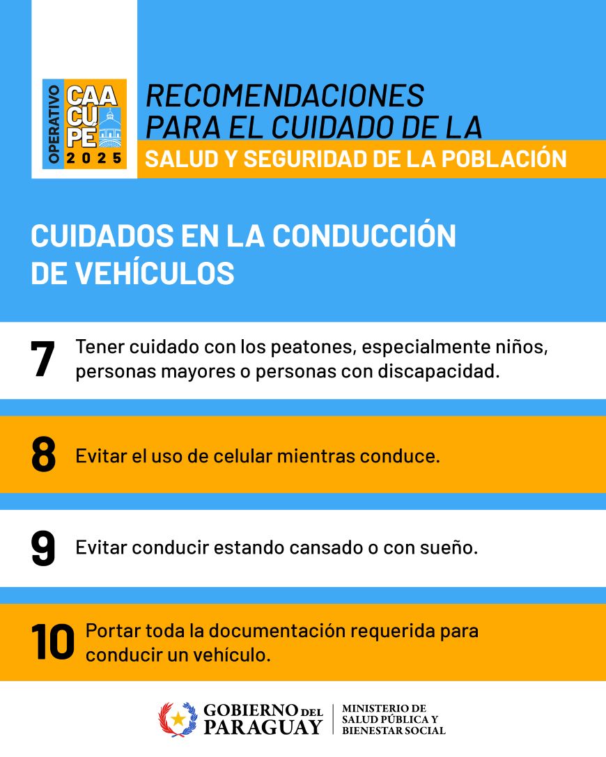 La cartera sanitaria recuerda a los automovilistas, peatones y motociclistas que circulan en zonas afectadas por la cobertura del Operativo Caacupé 2025, algunas medidas de seguridad para un retorno seguro a los hogares. - Para peatones: • Observar antes de atravesar alguna vía, utilizar las franjas peatonales, transitar por veredas o por las calzadas asignadas. • Sujetar siempre a los niños de la mano para cruzar. Ayudar a las personas mayores o con problemas de movilidad. • Prestar atención al subir o bajar de algún vehículo. Nunca hacerlo cuando aún está en movimiento. • Se recomienda a los peatones usar prendas con detalles reflectivos en horario nocturno. - A los automovilistas: • No circular a excesiva velocidad y respetar los kilómetros por hora establecidos por las autoridades. • No conducir de ninguna manera bajo los efectos del alcohol, drogas o sedantes. • Utilizar medidas de protección, como el uso de cinturón de seguridad para todos los pasajeros y sillitas adecuadas para los niños. • Mantener siempre la distancia prudencial entre vehículos. • Respetar los semáforos, así como las indicaciones de agentes del orden y señales de tránsito. • Evitar el uso de celular mientras se maneja un vehículo. • Controlar el buen funcionamiento del vehículo: luces adecuadas, frenos, llantas; realizar mantenimiento antes de viajar; portar balizas, extintores, ruedas de auxilio, botiquín de primeros auxilios. • Tener en la billetera el nombre y el número telefónico de una persona a quien contactar en caso de que ocurra algún percance. • No conducir estando cansado o con sueño. • Al circular en las rutas, mantener las luces encendidas (luz baja de día). • Conservar siempre la prudencia en las maniobras a realizar mientras se conduce. • Tener cuidado con peatones, especialmente niños, personas mayores o personas con discapacidad. • Estacionar adecuadamente sobre las banquinas y colocar obligatoriamente elementos de señalización. • Portar documentación requerida al conducir un vehículo, para evitar inconvenientes y agilizar controles. • Prestar atención a los carteles indicadores y/o al personal policial sobre los desvíos obligatorios. - A motociclistas: • Usar casco apropiado. Mejor si es integral, con protector de mandíbula. • No transportar más de dos personas, incluido el conductor. • No transportar a niños/as menores de doce años. • No conducir bajo los efectos de alcohol o drogas. • No conducir con exceso de velocidad. • Respetar las señales del tránsito. • Mantenerse en una vía, evitar zigzaguear entre los vehículos. • Observar siempre las bocacalles antes de cruzar. • Contar con las luces adecuadas y funcionando. • Utilizar vestimentas visibles y material reflectivo: chalecos, etc., que les haga visibles en rutas. • Evitar los puntos ciegos de la visión de los automovilistas. • Prestar atención a las condiciones de las rutas (presencia de arena, agua, aceite, baches, etc.). • Observar a vehículos estacionados, pues las puertas pueden abrirse repentinamente. - A conductores de vehículos del transporte público: • No conducir bajo los efectos de alcohol o drogas. No conducir con exceso de velocidad. • No utilizar el celular durante la conducción. Respetar las señales del tránsito. • Respetar a los usuarios: no alzar o bajar pasajeros cuando aún está en movimiento, ni llevar pasajeros en las estriberas. • Mantener el vehículo en condiciones y contar con las medidas de seguridad: balizas, extinguidores y otros. • Mantener las puertas del vehículo cerradas cuando está en movimiento. La ley prohíbe transportar pasajeros en las carrocerías de los vehículos de carga y de camionetas. - En caso de presenciar un accidente de tránsito: • No movilizar ni tocar al paciente accidentado. • Desde cualquier telefonía, llamar al 141 (Centro de Operaciones de SEME). Un médico regulador orientará sobre el manejo del caso, hasta la llegada de la ambulancia. - Medidas de seguridad para evitar otros tipos de lesiones: • Llevar elementos protectores del sol, a fin de evitar quemaduras e insolaciones. • Observar los lugares por donde se transita, a fin de evitar caídas. • Transitar por lugares seguros. • Obedecer las indicaciones establecidas de seguridad. Nunca descuidar a los niños/as.