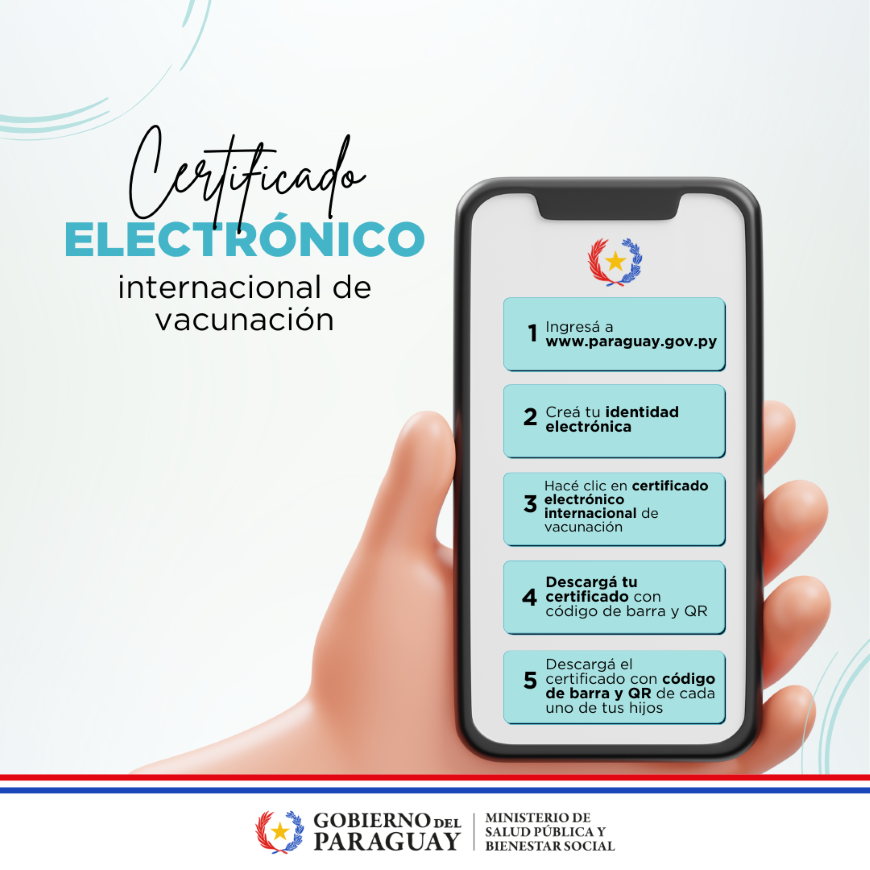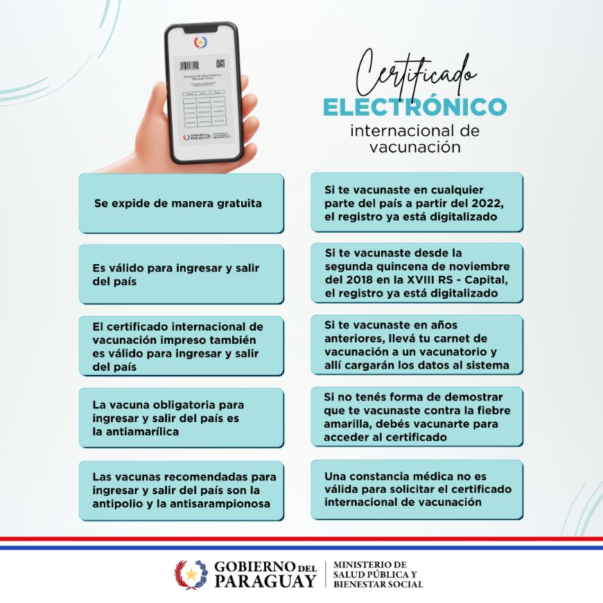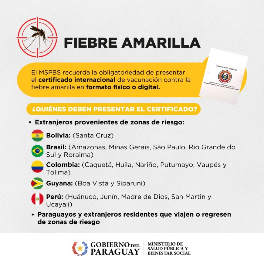El Ministerio de Salud Pública y Bienestar Social recuerda que es obligatorio presentar el Certificado Internacional de Vacunación contra la fiebre amarilla, en formato físico o digital, para: • El ingreso al país de extranjeros procedentes de zonas de riesgo. • La salida del país de paraguayos y extranjeros residentes que viajen a zonas de riesgo. Este requisito aplica a todas las personas de 1 a 59 años que provengan o se dirijan a áreas con circulación de fiebre amarilla. Zonas de riesgo: La obligatoriedad no aplica a todo el territorio de cada país, sino exclusivamente a viajeros procedentes de las siguientes áreas: • Bolivia: Santa Cruz • Brasil: Amazonas, Minas Gerais, São Paulo, Rio Grande do Sul y Roraima • Colombia: Caquetá, Huila, Nariño, Putumayo, Vaupés y Tolima • Guyana: Boa Vista y Siparuni • Perú: Huánuco, Junín, Madre de Dios, San Martín y Ucayali Este listado es dinámico y puede actualizarse según la situación epidemiológica y las alertas de la OPS/OMS. Emisión del Certificado Internacional Para obtener el certificado, se debe presentar el carnet de vacunación que acredite la aplicación de la dosis contra la fiebre amarilla. La expedición es gratuita, inmediata, no requiere visación y tiene validez de por vida. Si aún no está vacunado contra la fiebre amarilla Acudir al vacunatorio más cercano. Esta vacuna debe aplicarse anticipadamente, al menos 10 días antes del viaje, requerimiento para poder viajar. La vacuna antiamarílica es de dosis única y brinda protección para toda la vida, por lo cual no precisa dosis de refuerzo. Más información en Salud del viajero en el siguiente enlace: //dgvs.mspbs.gov.py/salud-del-viajero/requisitos-para-viajar-al-exterior/