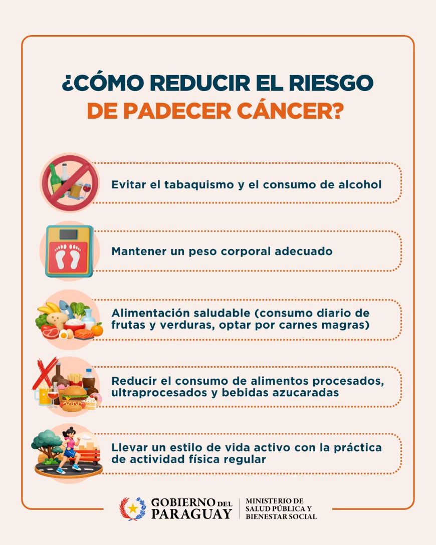 Cada 4 de febrero, se conmemora el Día Mundial contra el Cáncer, una fecha destinada a concienciar sobre la prevención, la detección temprana y el tratamiento oportuno de esta enfermedad que constituye uno de los principales desafíos de salud pública en Paraguay. En Paraguay, el cáncer continúa siendo una de las principales causas de muerte prematura, lo que refuerza la necesidad de priorizar la prevención y la detección precoz como políticas públicas sostenidas. El Ministerio de Salud Pública y Bienestar Social (MSPYBS), a través del Programa Nacional de Control del Cáncer (PRONAC) y en coordinación con el Instituto Nacional del Cáncer (INCAN), impulsa estrategias orientadas a fortalecer la prevención, la detección precoz, el diagnóstico oportuno y el tratamiento apliando la cobertura de la atención oncológica en todo el territorio nacional. En el marco del Día Mundial contra el Cáncer, la cartera sanitaria reafirma que el control del cáncer constituye una prioridad de Estado, que requiere continuidad de las políticas públicas, fortaleciendo el sistema de salud y la participación activa de la ciudadanía. La prevención, la detección precoz y el acceso equitativo a servicios oncológicos de calidad son pilares fundamentales para avanzar hacia una atención más justa, oportuna y efectiva, con el objetivo de salvar vidas y mejorar la calidad de vida de la población paraguaya. Estrategias de prevención y detección precoz implementadas • Cáncer de cuello uterino: implementación del tamizaje primario con prueba de VPH, complementado con citología convencional, seguimiento y tratamiento de los casos detectados, como estrategia central para la detección temprana de lesiones precursoras. • Cáncer de mama: fortalecimiento del tamizaje mediante mamografía, acompañado de acciones de capacitación técnica del personal de salud y optimización de los sistemas de lectura y diagnóstico. • Cáncer colorrectal: desarrollo de acciones de educación sanitaria y promoción del test de sangre oculta en heces como método de detección precoz, con enfoque progresivo hacia su implementación sistemática. • Cáncer de próstata: acciones de información y concienciación dirigidas a la población masculina, en el marco de la campaña Noviembre Azul, promoviendo el control oportuno y la consulta con profesionales de salud. Estas estrategias se complementan con campañas nacionales durante todo el año, fomentando la prevención y la detección precoz, así como con el fortalecimiento de los servicios diagnósticos y de seguimiento en el sistema público. Durante el año 2025, se avanzó de manera significativa en la implementación del tamizaje primario con pruebas de VPH en 17 Regiones Sanitarias, con la capacitación de más de 2.300 profesionales de la salud. En este periodo, más de 76.911 mujeres fueron tamizadas, identificándose aproximadamente 9.968 resultados positivos, lo que representa una prevalencia del 13 %. En paralelo, se realizaron más de 190.454 citologías cervicales, detectándose más de 2.896 resultados anormales. En el área de cáncer de mama, se fortaleció la capacidad diagnóstica mediante el monitoreo técnico de los 55 mamógrafos disponibles en el país, así como la capacitación especializada del personal de salud. En términos de producción, durante el año 2025 se registraron 68.384 mamografías, lo que representa un incremento de aproximadamente el 48,6 % en comparación con el año 2024. Adicionalmente, se desarrollaron acciones de educación sanitaria para la prevención del cáncer colorrectal en los departamentos de Concepción y Central, así como actividades educativas y preventivas dirigidas a empresas, universidades y medios de comunicación en el marco de la campaña “Noviembre Azul”, con una charla de cierre realizada en el PRONAC con presencia de autoridades del INCAN. De forma transversal, el PRONAC impulsó las campañas Marzo Verde, Octubre Rosa y Noviembre Azul durante todo el año. Más cifras de cáncer en el país Los datos recientes muestran una tendencia a la disminución de la mortalidad por cáncer (según registros de la Dirección General de Información Estratégica en Salud (DIGIES), lo que evidencia el impacto positivo de las políticas implementadas. No obstante, estos avances refuerzan la necesidad de sostener y profundizar los esfuerzos, con énfasis en la prevención y la detección temprana como estrategias clave para reducir de manera sostenida la carga de la enfermedad. En el país, alrededor de 12.000 nuevos casos son diagnosticados cada año y se registra que entre 4.000 y 4.500 personas fallecen anualmente por cáncer, posicionándose como una de las principales causas de muerte prematura antes de los 70 años. La detección precoz permite tratamientos más efectivos y menos invasivos, mejora la sobrevida y reduce el impacto social y económico de la enfermedad. Por ello, el Ministerio insta a la población a informarse, adoptar hábitos saludables y realizar los controles recomendados, como parte de un compromiso compartido para avanzar hacia una atención oncológica más equitativa y oportuna en Paraguay.