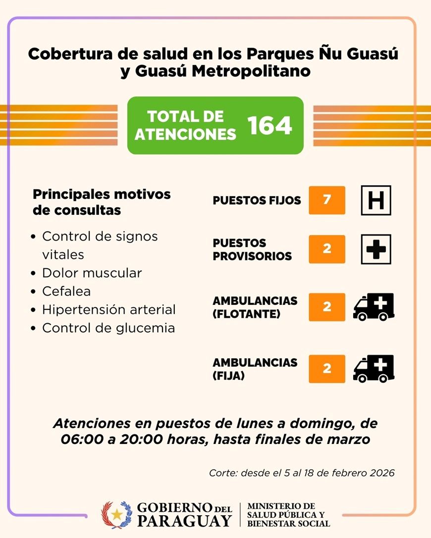 Ambos parques, ubicados en el área metropolitana de Asunción y que reciben actualmente a más de 8.000 personas por día, constituyen espacios para la recreación, el deporte y el contacto con la naturaleza, por lo que requieren una cobertura sanitaria acorde a su alta concurrencia. Desde el inicio del operativo el 05 de febrero hasta el último corte (18 de febrero 06:00), se registraron un total de 164 atenciones en ambos espacios públicos, en el marco de la cobertura especial de asistencia y respuesta inmediata. El plan contempla una estrategia operativa coordinada y multidisciplinaria, que incluye la instalación de una base flotante equipada con dos ambulancias de Soporte Vital Básico (SVB). Para la atención directa, se conformaron dos equipos de salud, integrados por médicos y personal de enfermería, que brindan cobertura diaria de 06:00 a 20:00 horas. Para garantizar una atención oportuna, se dispuso: • 7 puestos fijos de atención • 2 puestos provisorios • 2 ambulancias con base fija • 2 ambulancias con base flotante Este despliegue permite brindar asistencia inmediata ante consultas espontáneas y eventuales urgencias, asegurando la cobertura durante la permanencia masiva de ciudadanos en los parques. En el Parque Ñu Guasú se realizaron 115 atenciones, mientras que en el Parque Guasú Metropolitano se contabilizaron 47 atenciones. Entre los principales motivos de consulta predominan el control de signos vitales (presión arterial), dolor muscular, cefalea, control de glicemia y golpes y traumatismos de partes blandas. Asimismo, se efectuaron 2 derivaciones al SEME (Base Central) y traslado a servicios privados de pacientes con seguro médico, conforme a la evaluación médica correspondiente. La implementación del plan es coordinada por diversas dependencias del MSPBS, entre ellas la Dirección General de Desarrollo de Servicios y Redes de Salud, la Dirección de Atención Primaria de la Salud (APS), la Dirección General de Vigilancia de la Salud (DGVS), el SEME, y otras áreas vinculadas a insumos y promoción de la salud. Asimismo, se cuenta con el respaldo de hospitales de referencia de Asunción, Capital y Central, que garantizan la atención de urgencias y la derivación de casos de alta complejidad en el caso de requerirse. Con esta iniciativa, el Ministerio de Salud Pública y Bienestar Social responde a su responsabilidad con la salud de la población, promoviendo espacios de recreación seguros, con entornos saludables y una respuesta sanitaria cercana para todas las personas que disfrutan de los parques de esparcimiento del área metropolitana, como una estrategia interinstitucional con el MOPC de garantizar el acceso a servicios de salud, y el bienestar de la población.