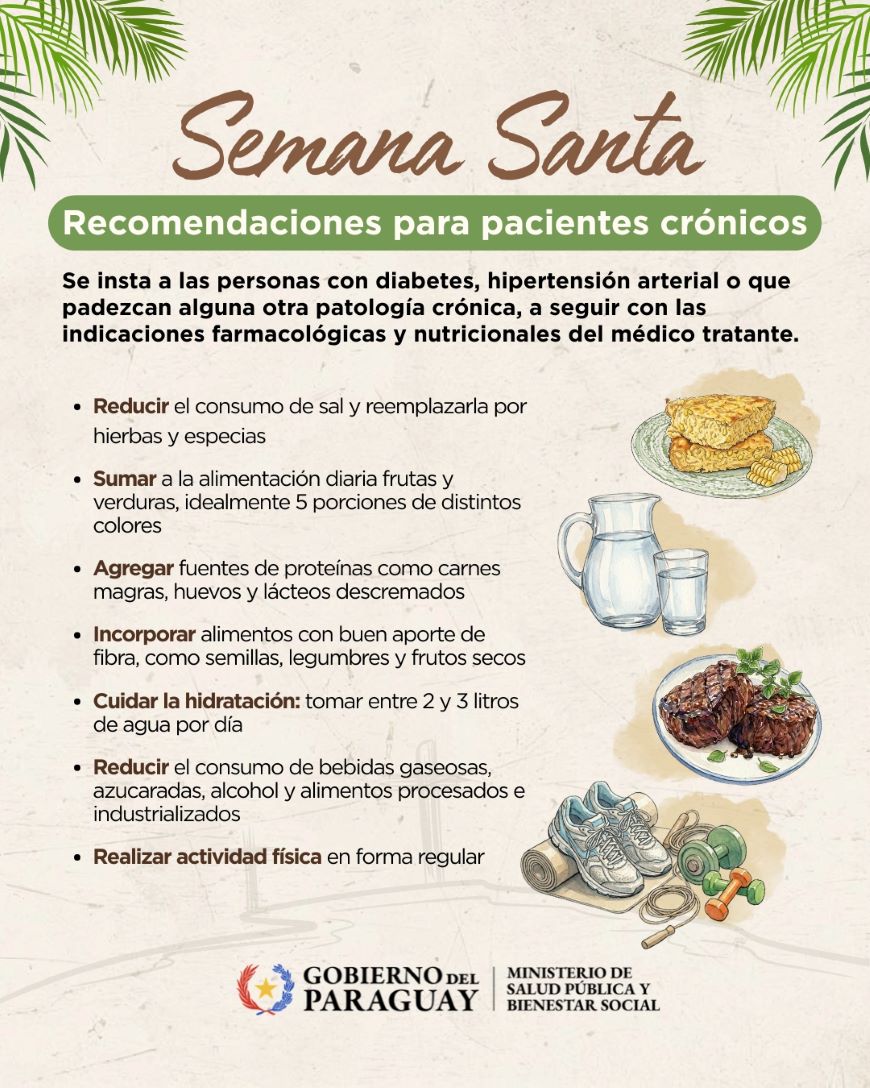 La Semana Santa es una de las festividades religiosas más importantes y, en nuestro país, es la época en la que existe una mayor oferta de alimentos ricos en hidratos de carbono, grasas saturadas y muy calóricos. Por esta razón, se recomienda a la población cuidar la salud evitando los excesos alimentarios durante estos días de reflexión. Hay que tener en cuenta que las personas con enfermedades crónicas de base, como obesidad, diabetes, hipertensión arterial u otras afecciones, deben cuidar aún más la alimentación para evitar descompensaciones, que como consecuencia podrían traer problemas de salud aún mayores. Se aconseja comer con moderación. Disfrutar de la comida tradicional como la chipa, sopa, chipa guasu y otros sabrosos platos de forma equilibrada, para evitar que el cuerpo no se resienta. La clave para disfrutar de estos días santos es tratar de mantener una alimentación planificada, además de no descuidar la actividad física, cuya práctica es fundamental para mantener niveles óptimos de presión arterial, peso y glicemia, además de un sinfín de beneficios. El Departamento de Factores de Riesgo, dependiente de la Dirección de Vigilancia de Enfermedades No Transmisibles, recomienda: Se solicita a aquellos pacientes que se encuentran bajo medicación seguir estrictamente las indicaciones de su médico tratante.