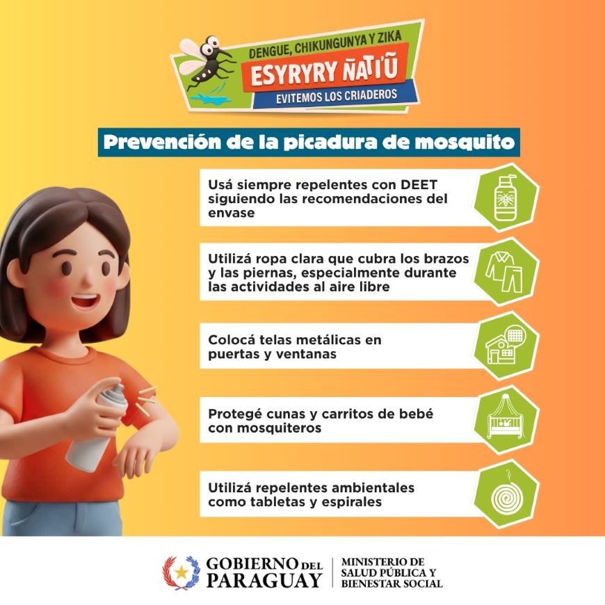 El Ministerio de Salud Pública recomienda no viajar en caso de presentar síntomas como fiebre, dolores musculares, articulares y de cabeza, o algún otro malestar, ante el riesgo de dispersión de casos de dengue en esta Semana Santa. Debido al masivo desplazamiento de personas al interior o exterior del país, se recomienda no viajar en caso de presentar síntomas de dengue. Se insta además a la consulta oportuna y evitar la automedicación que puede llevar a complicaciones, por lo que es vital concurrir al servicio de salud ante el primer síntoma, guardar reposo hasta la resolución del cuadro. Situación epidemiológica Datos parciales de Vigilancia de la Salud señalan que en las últimas semanas se evidencia un nuevo descenso en la variación porcentual del 16 % en las notificaciones a nivel país. El promedio de notificaciones de dengue es de 363 por semana. Desde la semana (SE) 10 a la (SE) 12 se han confirmado 20 casos de dengue: en Central (10), Asunción (8) y en Concepción (2), identificándose los serotipos DENV-1 y DENV-2. A la fecha, son 119 los casos con diagnóstico de dengue acumulados en Paraguay, de acuerdo al último reporte. Así también se confirmaron 2 personas hospitalizadas por dengue, procedentes de Asunción (1) y San Lorenzo (1). Todos los pacientes ya fueron dados de alta. No se reportan casos fallecidos. El brote de dengue en Limpio sigue en curso, con disminución de casos en las últimas semanas. Actualmente, diez regiones del país presentan aumento de notificaciones. Estas son: Itapúa, Alto Paraná, Paraguarí, Guairá, San Pedro, Pdte. Hayes, Concepción, Misiones, Boquerón y Alto Paraguay. Chikungunya En lo que respecta a esta vigilancia, en las últimas tres semanas se reportan 4 casos de chikungunya en Amambay, todos procedentes del distrito de Pedro Juan Caballero. En lo que va del 2026, suman 8 los casos confirmados de chikungunya en el territorio nacional, dos de ellos, importados de Bolivia. Recomendaciones La prevención de los criaderos de mosquitos es esencial para mitigar la propagación de casos de dengue, chikungunya y otras arbovirosis. Como medida de protección, se recuerda usar repelente y mosquitero en camas, cunas y carritos, así como tela metálica en puertas y ventanas. Acudir a la consulta médica ante la aparición de síntomas, como fiebre, dolor corporal o de cabeza u otro malestar, y evitar la automedicación. Atendiendo a la alerta de chikungunya por aumento de casos en las Américas, se recomienda: En caso de viajar a una zona con circulación de chikungunya, utilizar ropas que protejan contra las picaduras de los insectos; usar repelente y mosquitero. Si durante la estancia en el extranjero o hasta 15 días después del retorno presenta síntomas: fiebre, dolor intenso en las articulaciones, vómitos o algún otro malestar, no automedicarse y acudir de inmediato al servicio de salud. Para prevenir criaderos de mosquitos: · Desechar todo objeto en desuso que acumule agua (tapitas, botellas, envases). Aquellos objetos inservibles que no puedan desecharse como aparatos domésticos, neumáticos u otros, deben colocarse bajo techo o cubrirse de forma que evite que puedan acumular agua. · Clorar las piscinas para impedir la reproducción de mosquitos, teniendo en cuenta que cualquier recipiente con agua puede convertirse en un criadero del dengue y otras arbovirosis. · Mantener tapados tanques, tambores, cubetas y cualquier recipiente que contenga agua a ser utilizada. · Cambiar el agua del bebedero de los animales todos los días, previa higiene (con cepillo, agua y jabón), a los efectos de eliminar posibles huevos que hayan quedado adheridos en las paredes del recipiente. · Usar arena húmeda en los floreros. Desechar el agua acumulada en platos de macetas/planteras. · Limpiar las canaletas con regularidad. · Cuidar que no se acumule basura en el interior de los registros de manera que el agua esté drenada.
