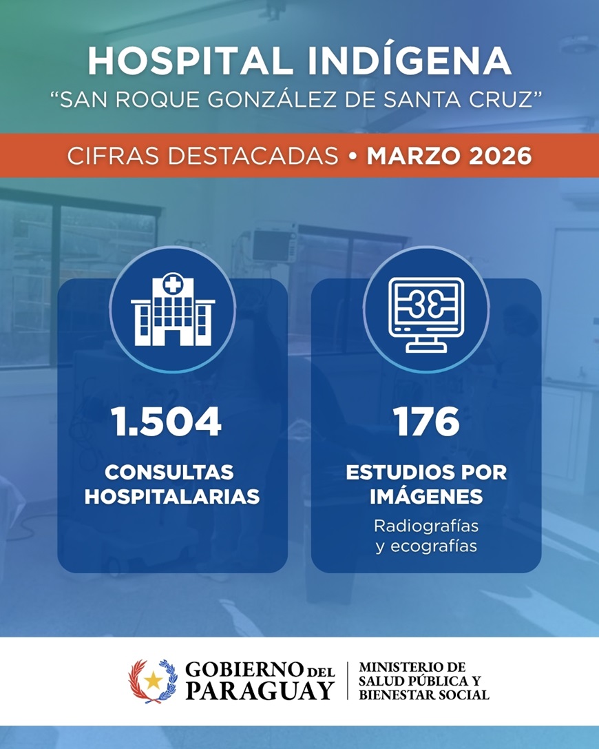 Con esta cifra total de 1.504 consultas, el servicio se consolida como un servicio especializado para comunidades indígenas ubicadas en la localidad de Limpio, departamento Central. Del total de atenciones realizadas en el tercer mes del año, se distribuyen de la siguiente manera: • 1.224 consultas externas, correspondientes a atención médica ambulatoria especializada sin internación, que incluyen servicios como clínica médica, odontología, nutrición y psicología, entre otros. • 280 consultas en el área de urgencias, garantizando respuesta oportuna ante situaciones que requieren atención inmediata. En el área de apoyo diagnóstico, el hospital llevó adelante 176 estudios por imágenes, que incluyeron ecografías, electrocardiogramas y radiografías, contribuyendo a diagnósticos oportunos y tratamientos adecuados. Como parte del abastecimiento continuo de insumos y medicamentos, el MSPBS distribuyó al Hospital Indígena por un valor total de G. 121.612.978. Estos resultados demuestran el compromiso del equipo de salud con la atención integral, intercultural y de calidad, priorizando el acceso equitativo a los servicios de salud y fortaleciendo la cobertura en beneficio de las comunidades indígenas. El servicio trabaja fundamentalmente en el sistema de referencia y contrarreferencia nacional, en Redes Integradas e Integrales de Servicios de Salud (RIISS). Cuenta además con una ambulancia para la derivación de pacientes a otros centros de referencia de alta complejidad. El Ministerio de Salud Pública mantiene su responsabilidad de continuar trabajando para garantizar servicios accesibles y de calidad en todo el territorio nacional.