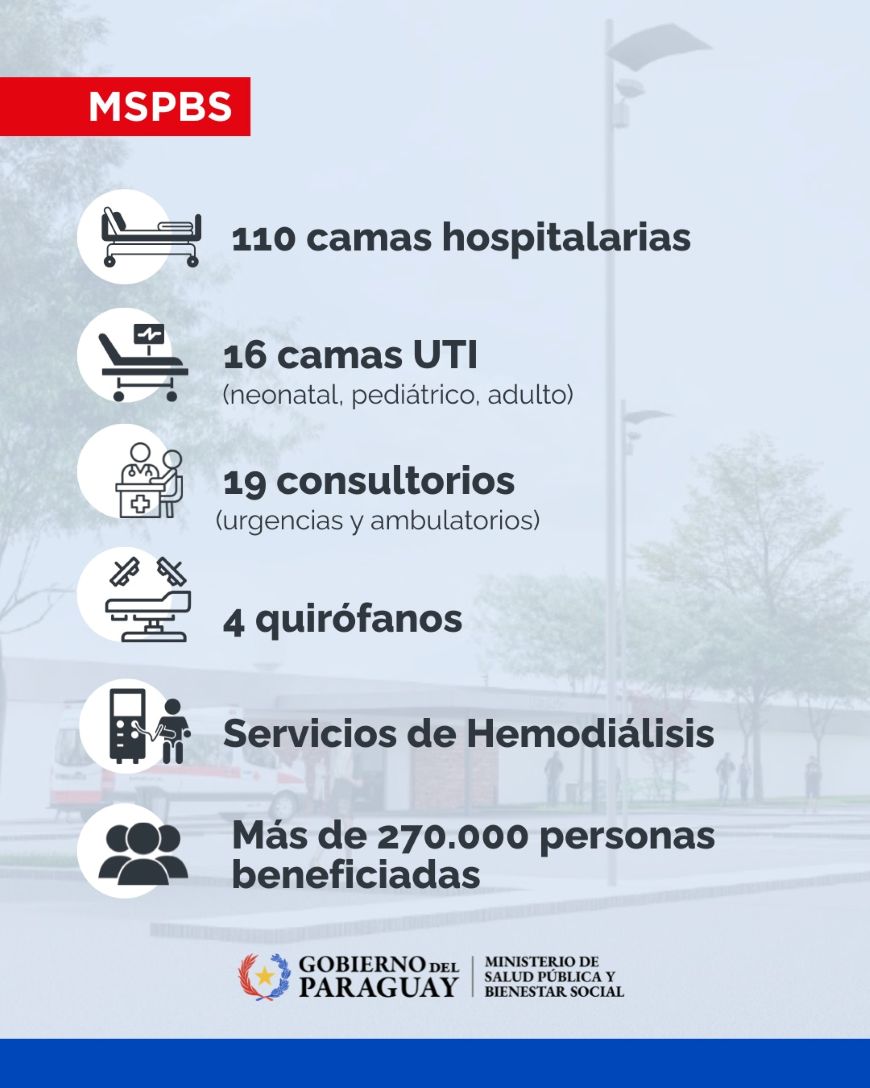 • La construcción del nuevo Hospital General de Curuguaty representa un avance significativo para el acceso a servicios de salud de calidad en el departamento de Canindeyú y la zona norte del país, beneficiando directamente a más de 270.000 personas con un centro asistencial moderno y equipado para responder a las necesidades sanitarias de la región.