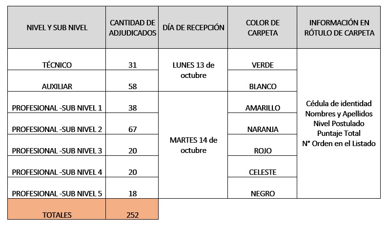 La RECEPCIÓN DE DOCUMENTACIONES EN FÍSICO de los postulantes ADJUDICADOS, en cumplimiento de lo dispuesto en el Reglamento General del concurso, “ARTÍCULO 21, inciso 12- EL POSTULANTE ADJUDICADO DEBERÁ PRESENTAR EN FORMATO IMPRESO EN UN PLAZO DE 2 DÍAS HÁBILES POSTERIOR AL CIERRE DEL CONCURSO…”, por ello, se dispone para los postulantes ADJUDICADOS del MINISTERIO DE SALUD PÚBLICA Y BIENESTAR SOCIAL la entrega de los documentos en físico según el siguiente detalle: